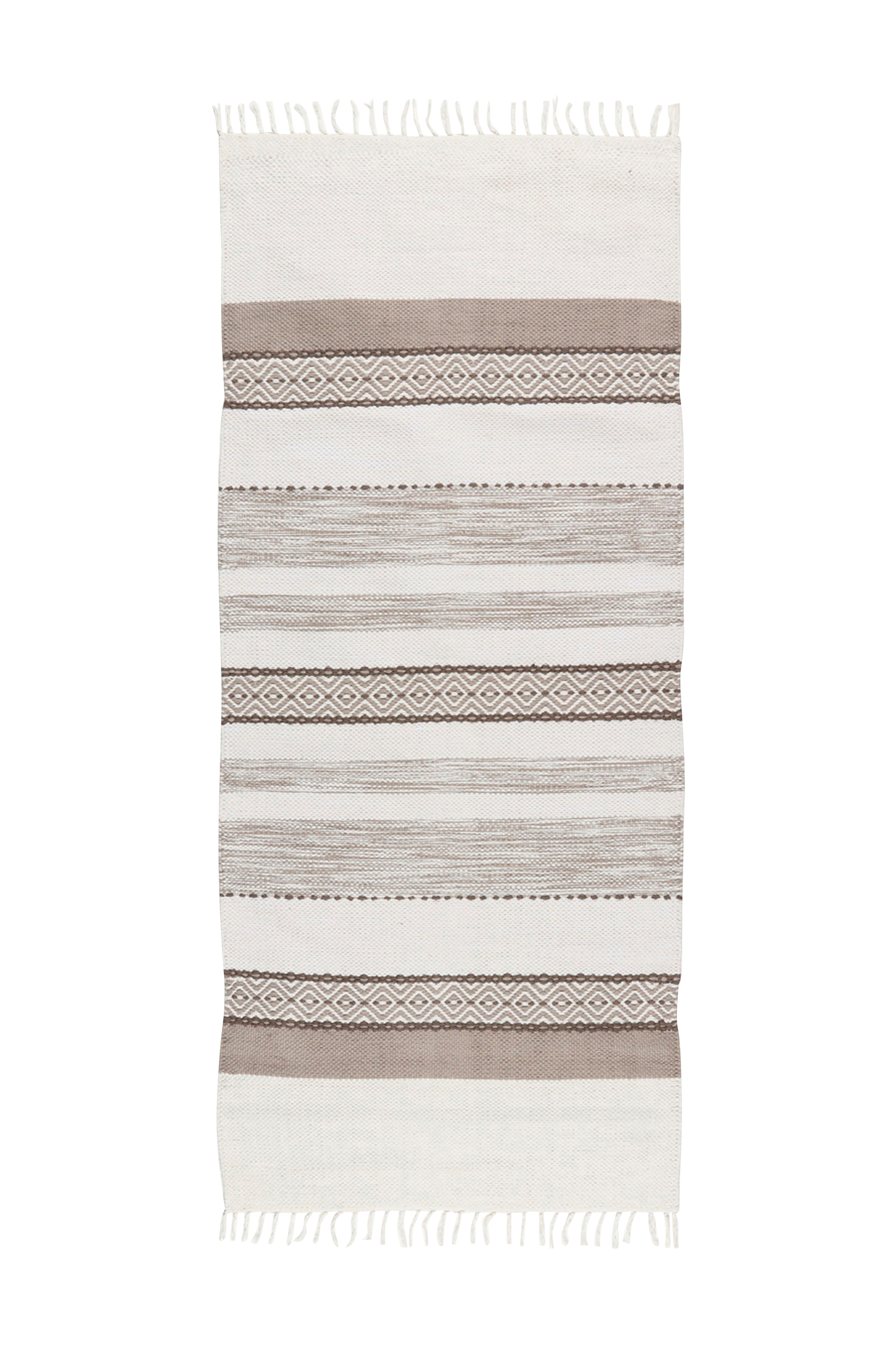 Åby er et stribet garntæppe i fin bomuldskvalitet. Tæppet er vævet i et stribet mønster som minder om de traditionelle kludetæpper. De stribede partier har forskellig bredde, nuance og mønster. Nogle striber er vævet i klassisk gåseøjemønster som giver et moderne twist til tæppets traditionelle udtryk. Tæppet er fremstillet af bomuldsgarn og har frynser i enderne. Bomuld er et smukt naturmateriale som er let at vedligeholde. Tæppet kan vaskes ved 30 grader og kan også vendes, hvilket er praktisk, hvis der skulle opstå en lille plet. Åby er et praktisk og frisk garntæppe, der passer godt ind i f.eks. køkkenet, fritidshuset eller vaskerummet.