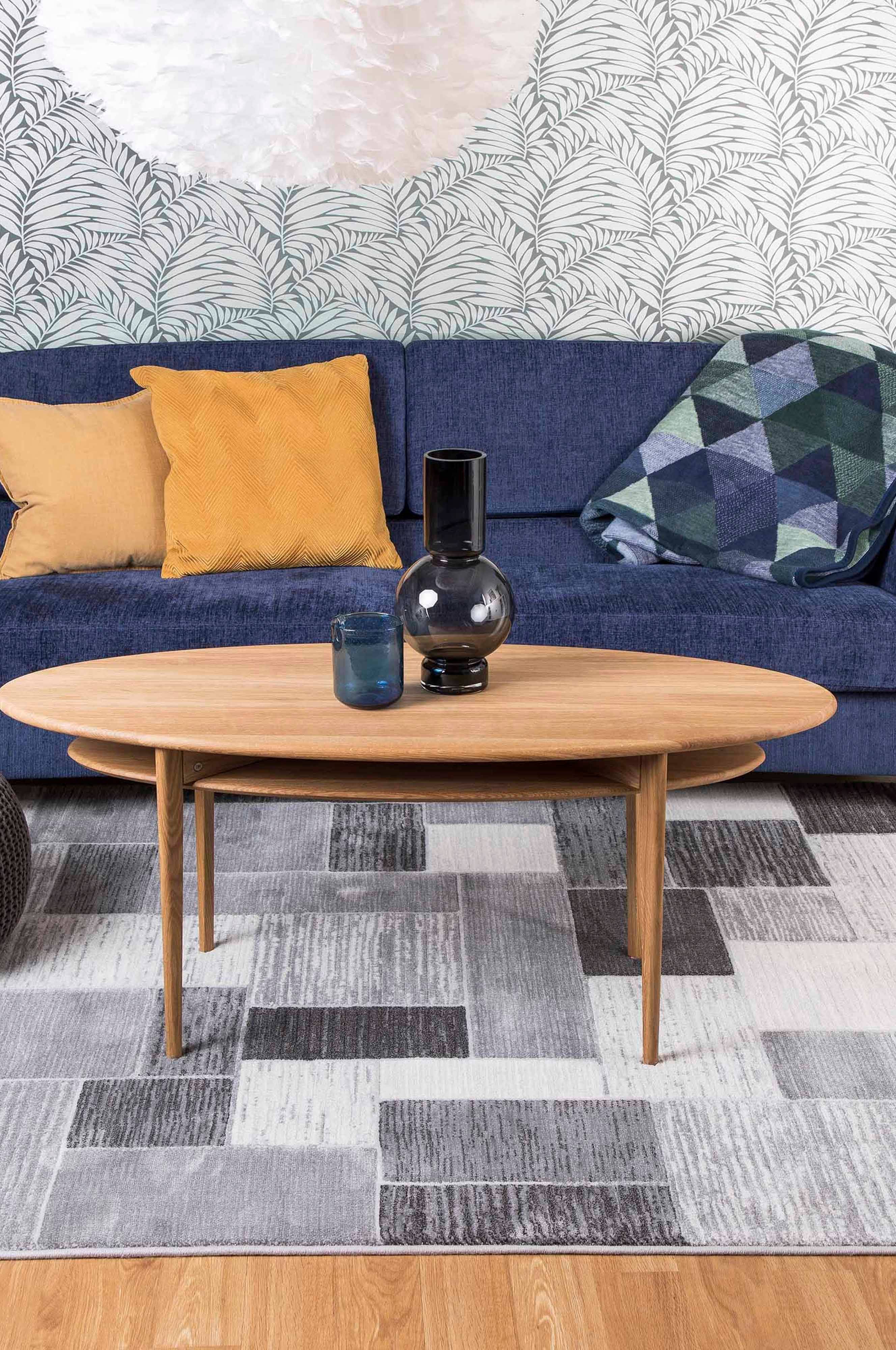 Et maskinfremstillet tæppe af høj kvalitet. Den tætte og fine luv er tyk og blød og er skåret i lidt forskellige længder hvilket giver en fin struktur og livlig overflade. Gulvtæppet har et ternet mønster i en smuk farveskala.