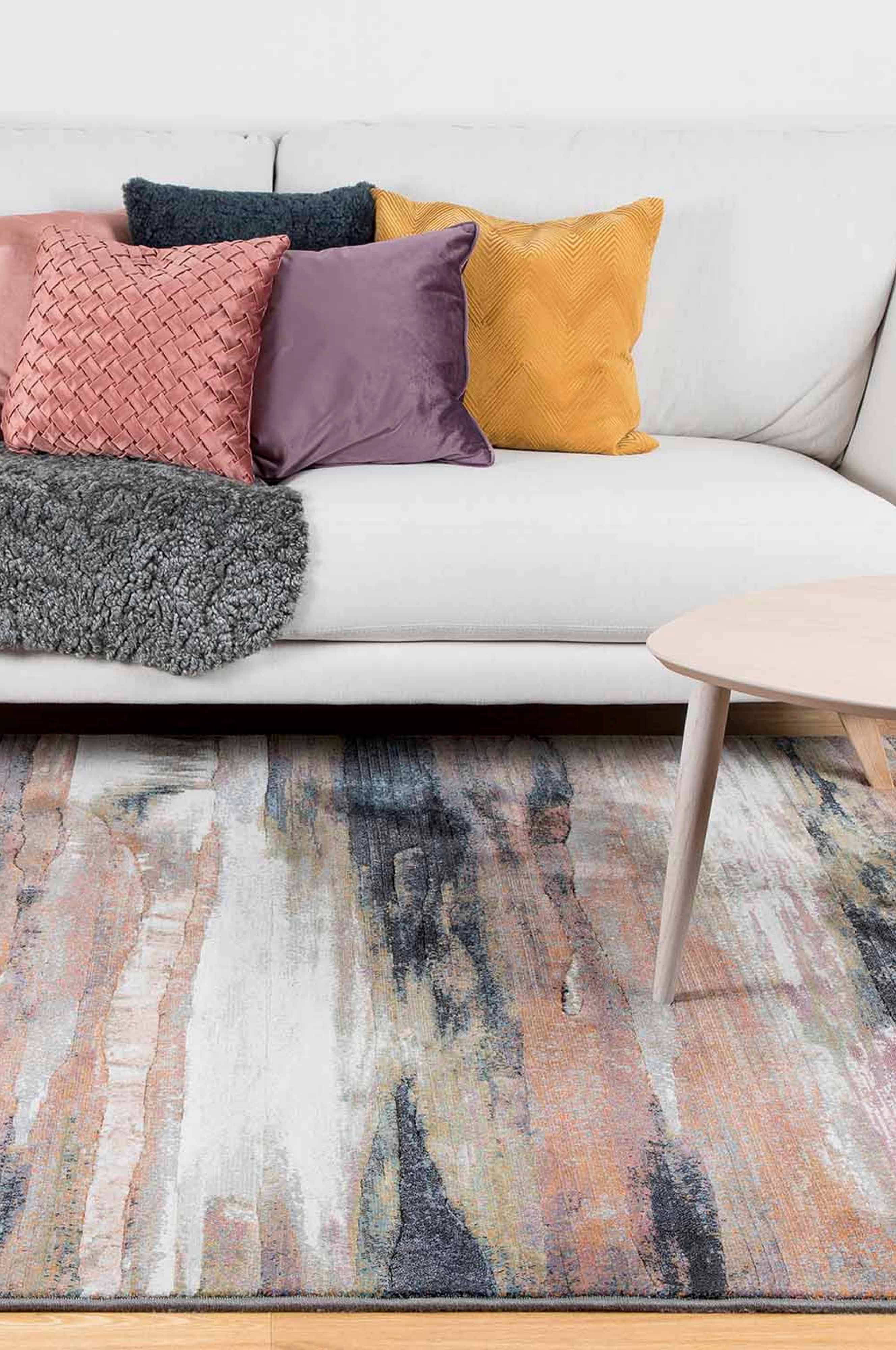 Wiltontæppe i syntetmateriale af høj kvalitet. Den skårede, tætte luv gør at tæppet føles blødt og skønt at sætte fødderne på. Gulvtæppet har et abstrakt mønster i behagelige farvetoner. Let at støvsuge og holde rent.