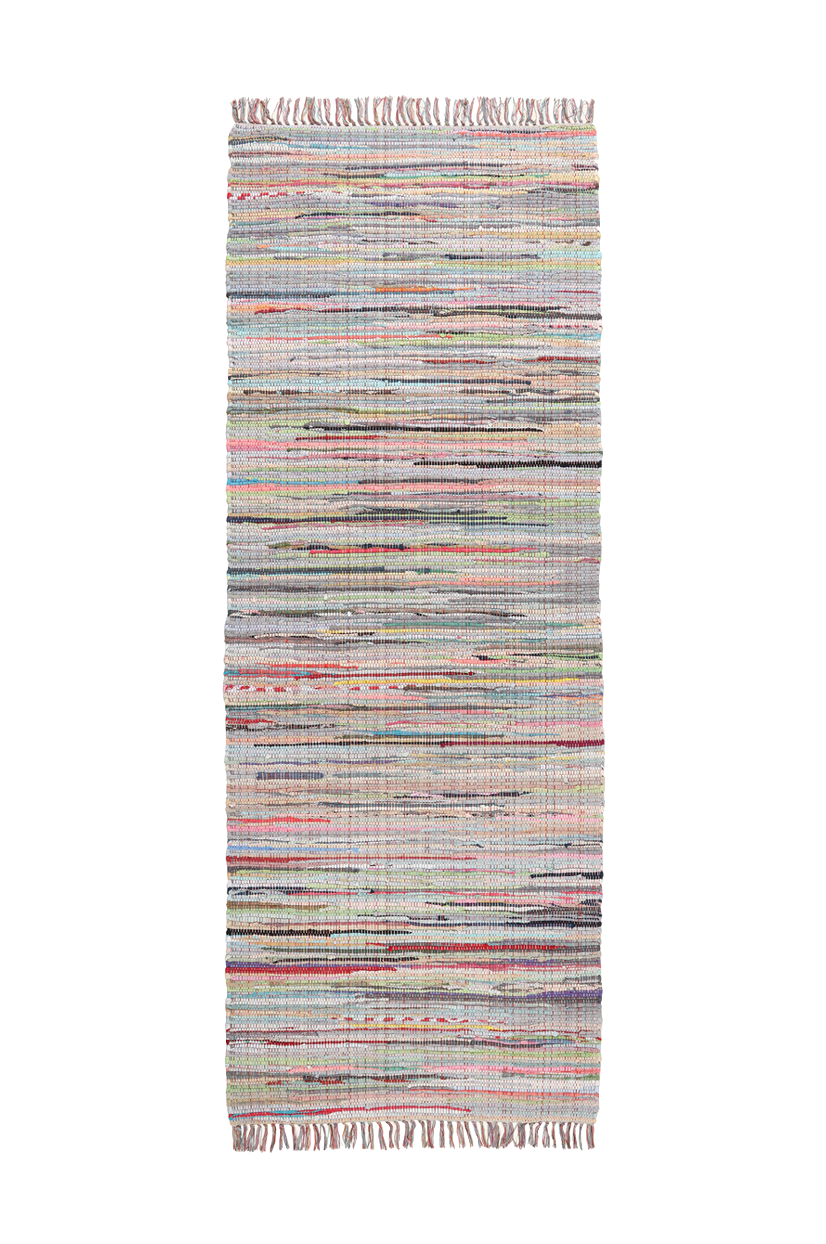 Kludetæppe i bomuld med frynser. Gulvtæppet er vævet i et meleret mønster i skønne farver. Klassisk kludetæppe af høj kvalitet som giver en indbydende og hyggelig atmosfære i køkkenet, entreen eller soveværelset.