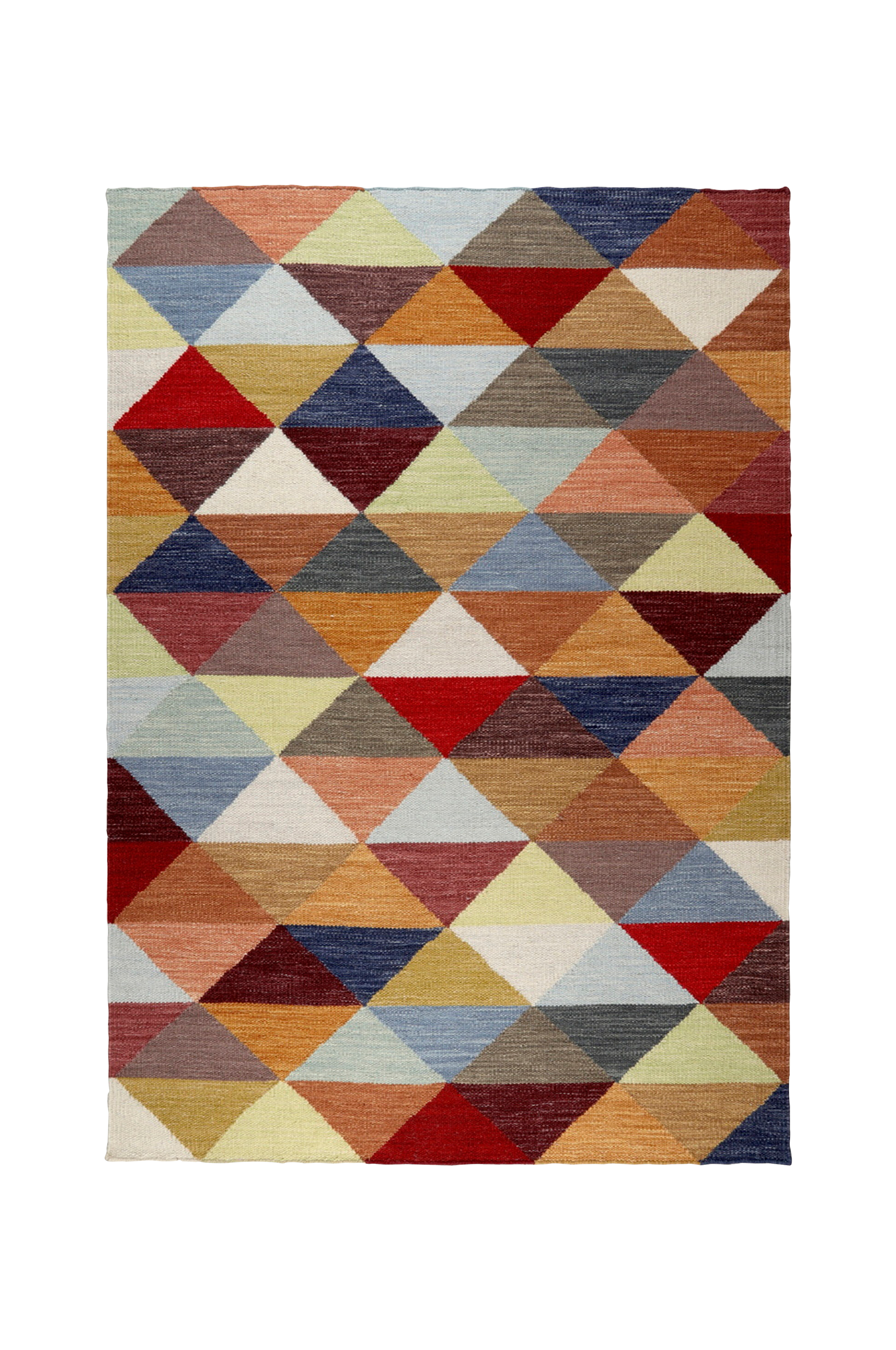 Håndvævet uldtæppe med et grafisk trekantsmønster i skarpe farver. Et farvestrålende tæppe som giver et skønt pift til boligen. Taza er fremstillet i slidstærk og praktisk uld og fordi det også er vendbart, forlænges tæppets levetid.
