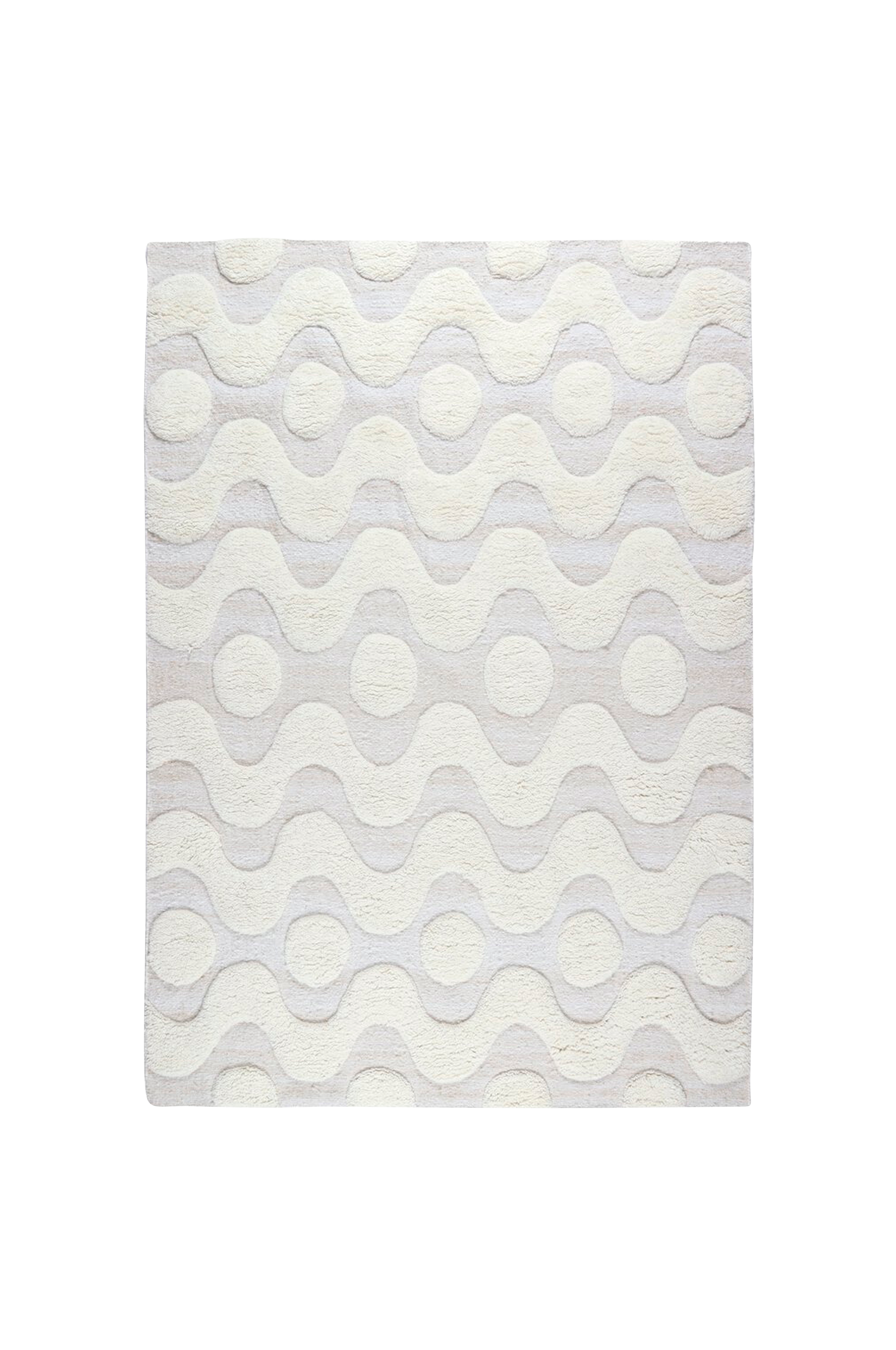Håndvævet tæppe i en skøn materialeblanding af uld (50 %), bomuld og kæledyrsgarn. Tæppet er håndlavet og har en glatvævet bund med bløde tuftede sektioner med længere luv. Det høje og lave mønster består af blødt bølgede og runde former. Et livligt tæppe, der på trods af sit enkle design gør et stort indtryk.