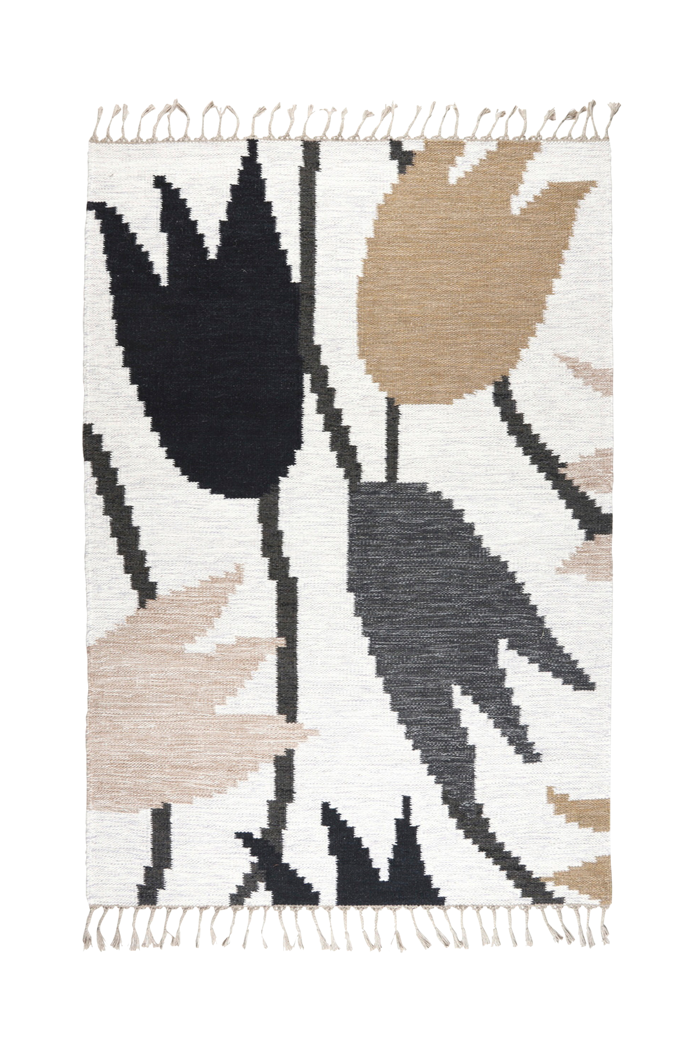 Håndknyttet uldtæppe med et udtryksfuldt mønster. Tæppet er en del af en spændende og unik tæppekollektion som designeren Ulrika Hydman Vallien har designet for InHouse Group. En kollektion, som passer perfekt til den, der ønsker et lille ekstra touch. Tæpperne er kendetegnet ved designerens karakteristiske slyngende slanger, tulipaner og ansigter.