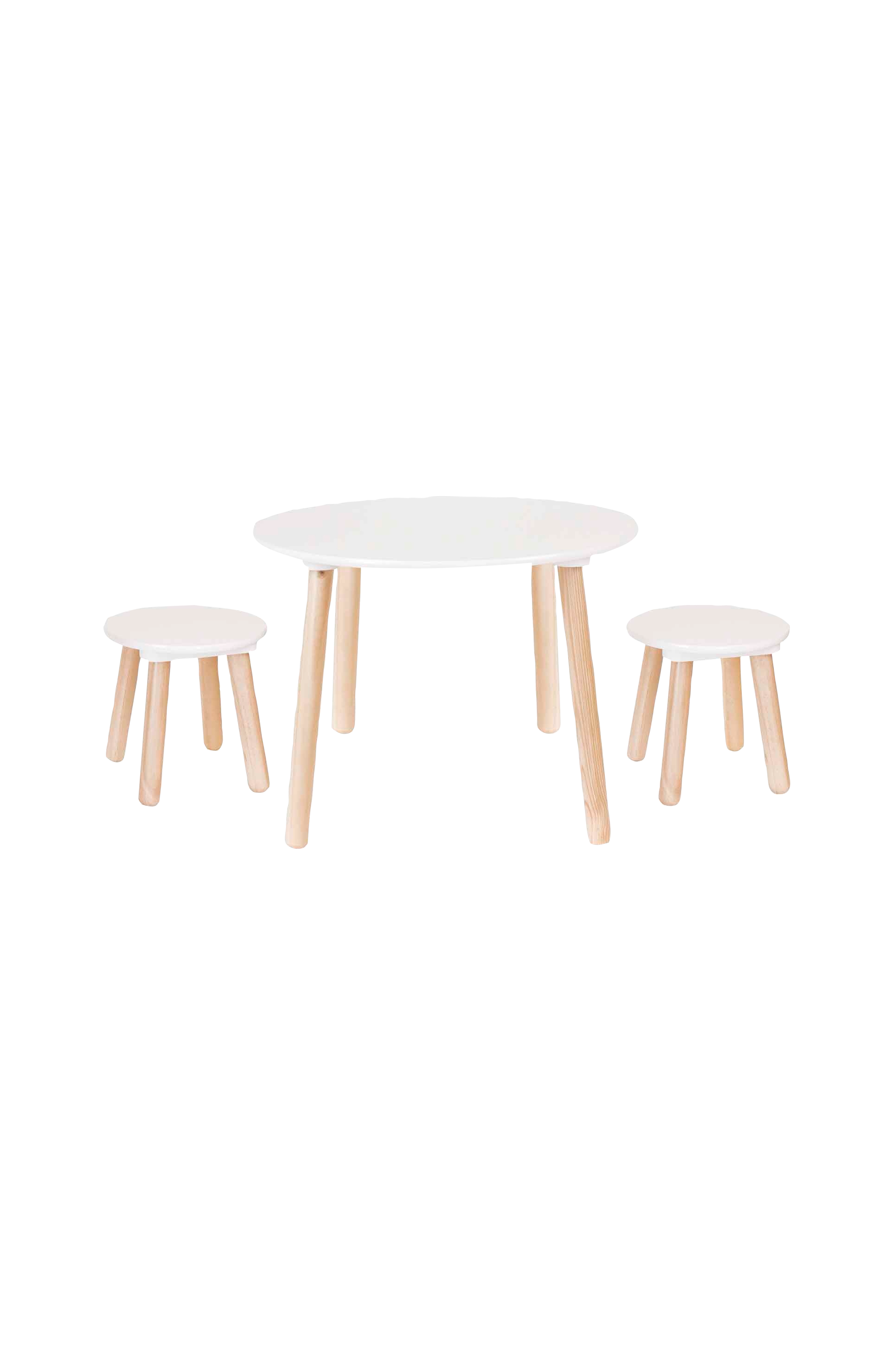 Fint og stilrent rundt bord med to skamler i træ. Perfkete til børneværelset!