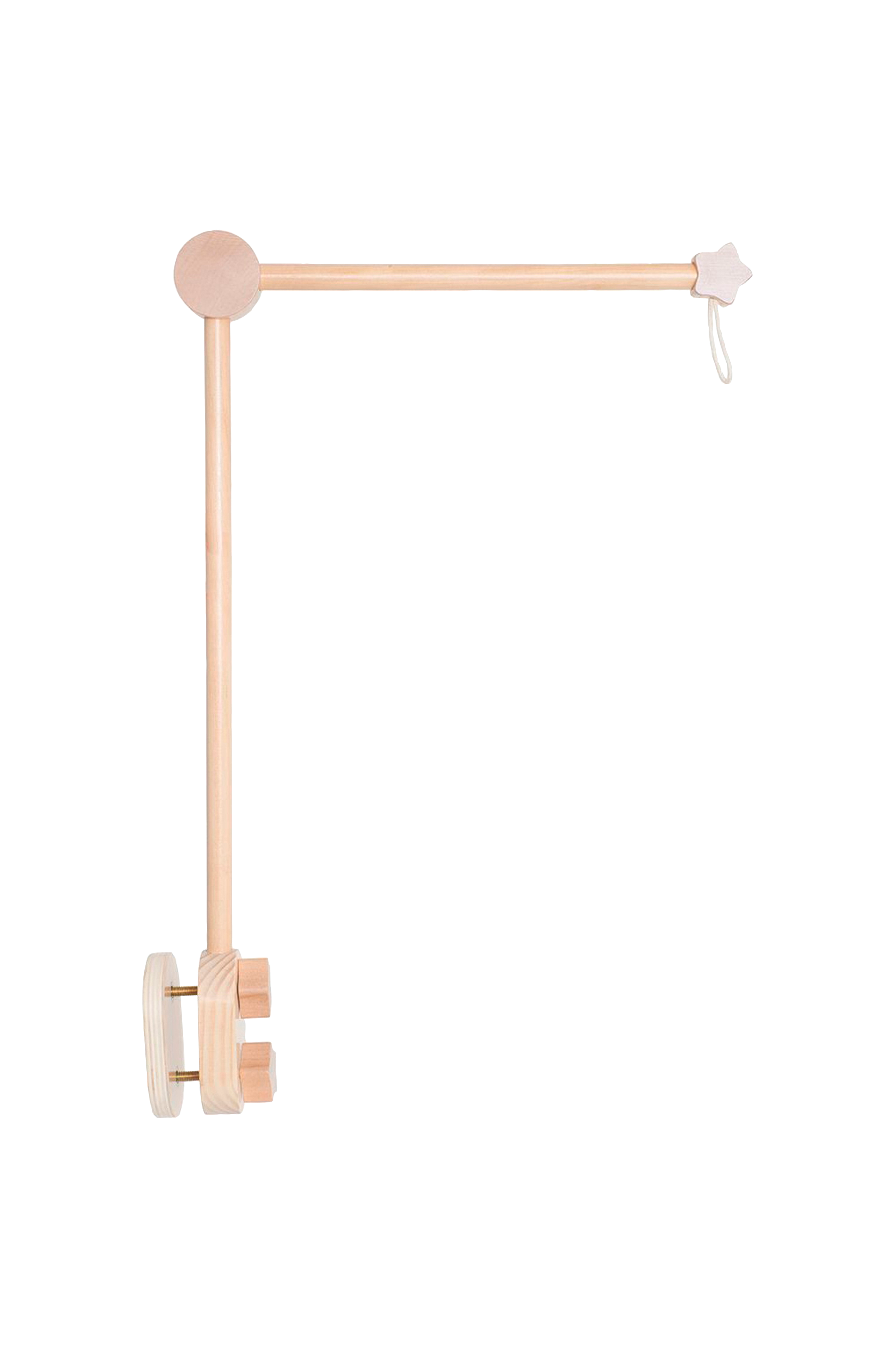 Stilren holder af træ til en uro, dekoreret med stjerneformede detaljer. Skru ganske enkelt uroholderen fast på tremmesengen, og sæt en valgfri sød sengeuro på. Uroholderen passer også til alle typer babyuroer.
