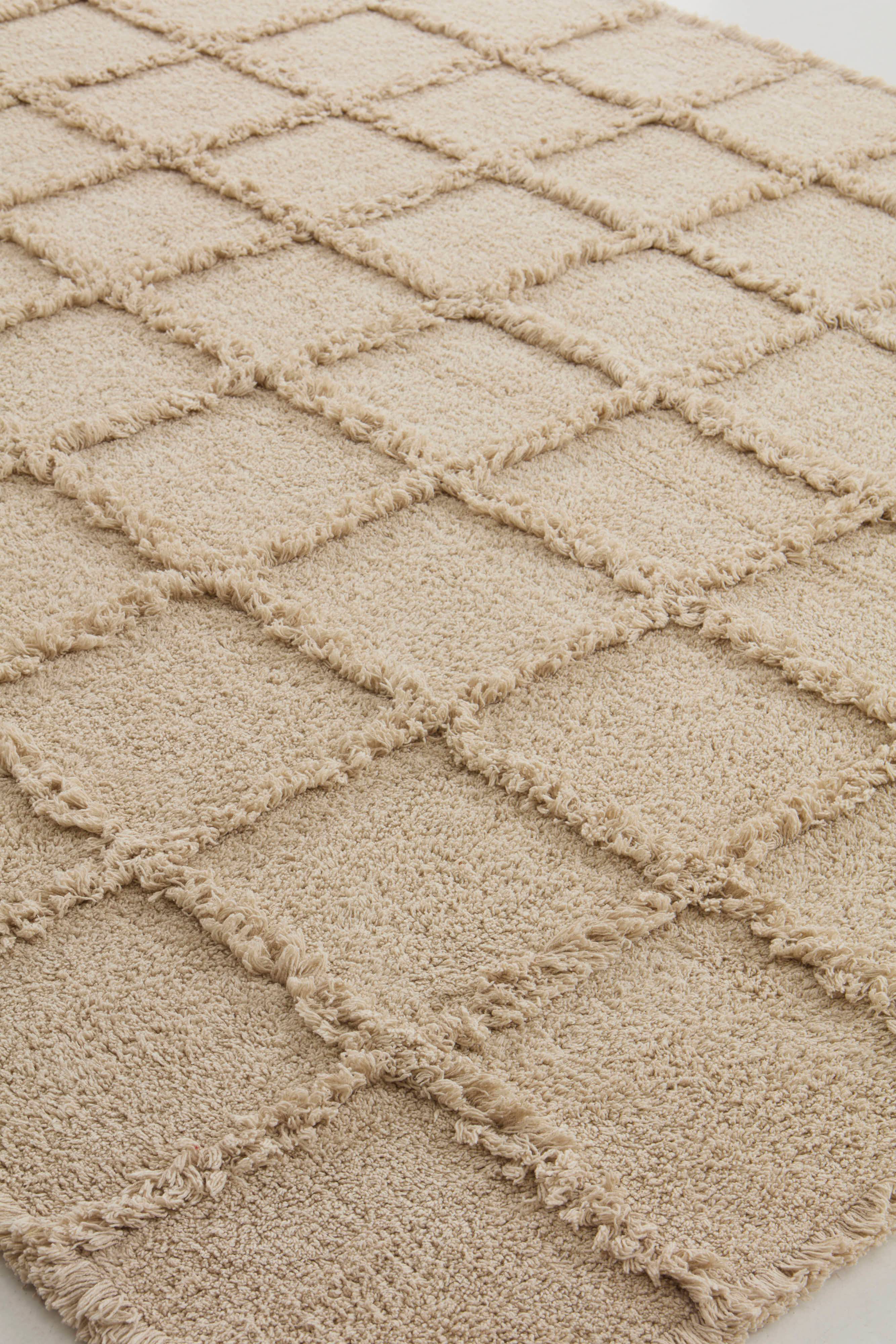 Det tuftede bomuldstæppe bringer varme til soveværelset med sine indbydende naturlige toner. Den skiftevis korte og lange luvhøjde skaber en dejlig tekstur og et mønster, mens den bløde fornemmelse giver komfort under fødderne. En perfekt blanding af stil og blødhed til dit hjem.