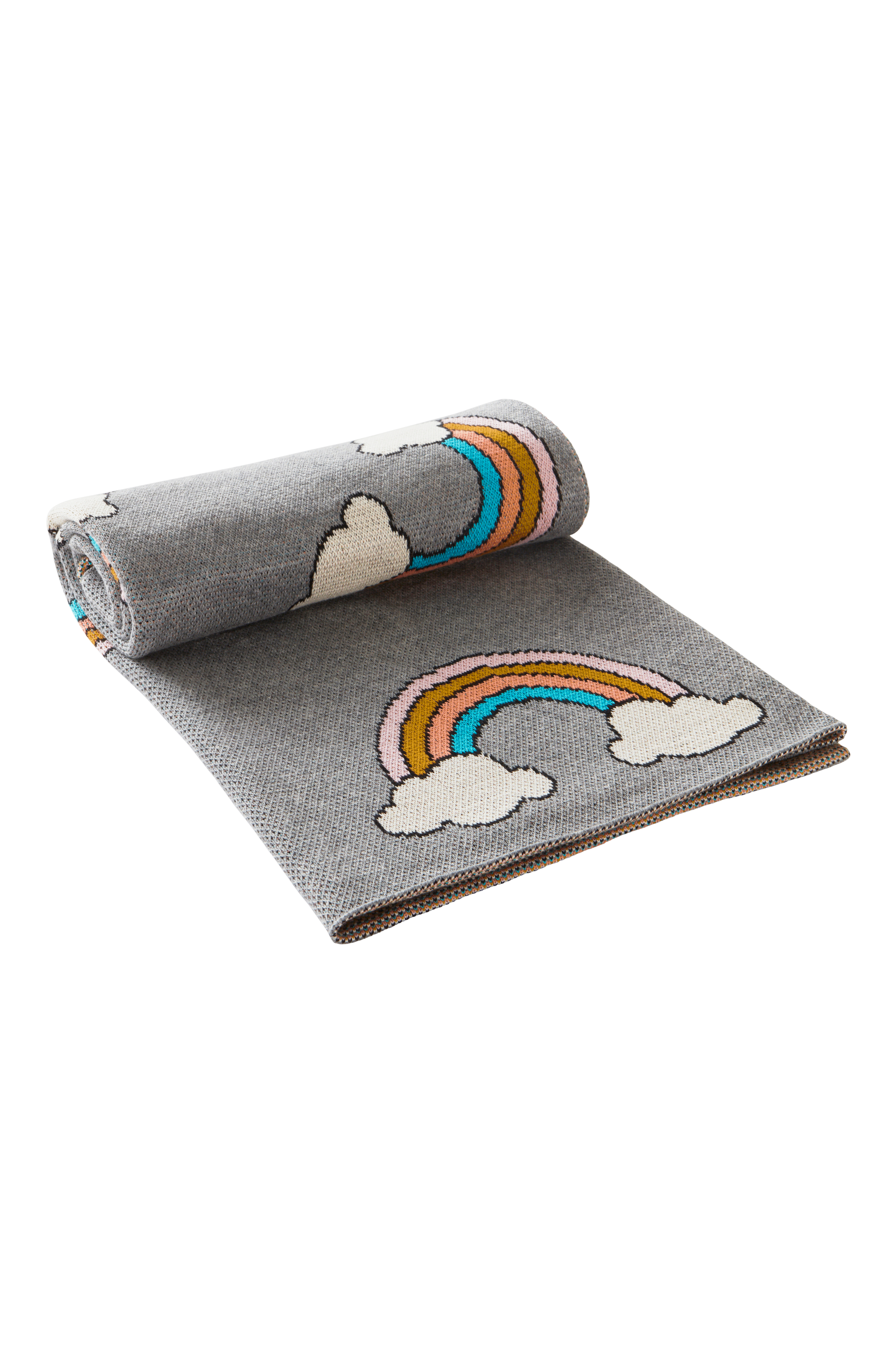 Hyggeligt babytæppe i økologisk bomuld med mange anvendelsesmuligheder. ALIVIA babytæppe har et fint mønster med regnbuer og passer godt som både dyne og sutteklud.