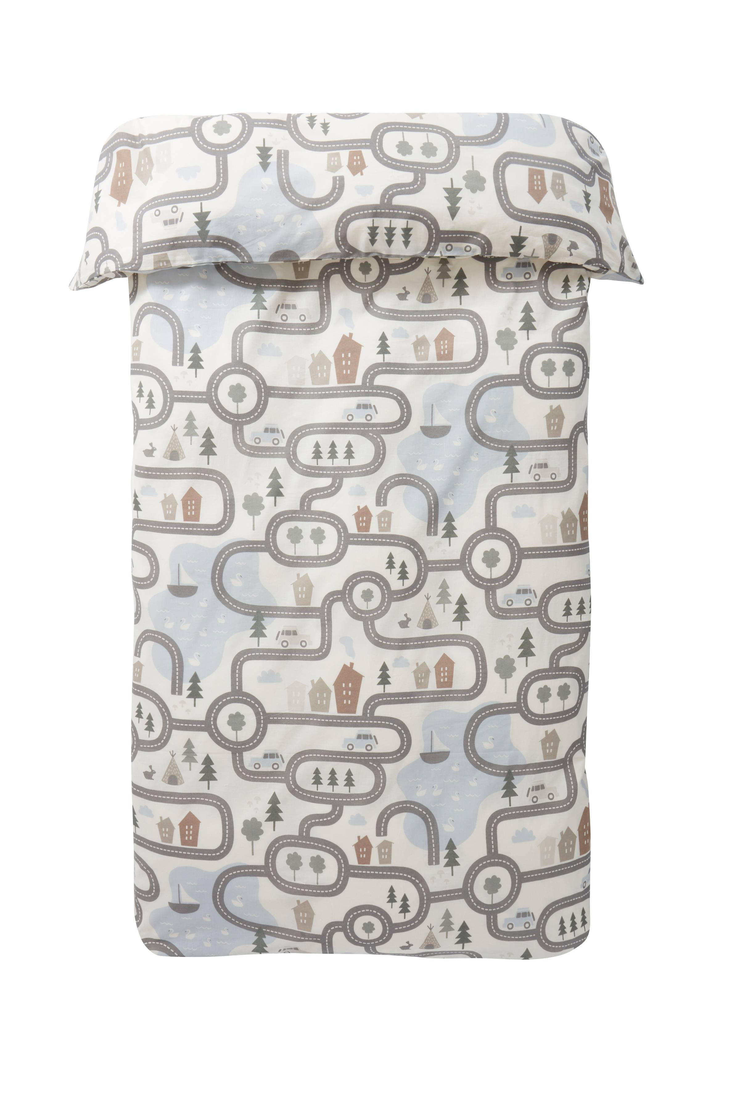 Dynebetræk i økologisk bomuld med mønsterprint i milde, harmoniske farver. Motivet er en myldrende by med veje, huse, dyr og natur. Økologisk bomuld er skønt at sove i, køligt og blødt mod huden. Trådtæthed på 144 tc. (Trådtætheden angiver antal tråde, Thread Count, pr. kvadrattomme i et stof. Jo højere trådtæthed desto højere kvalitet.)