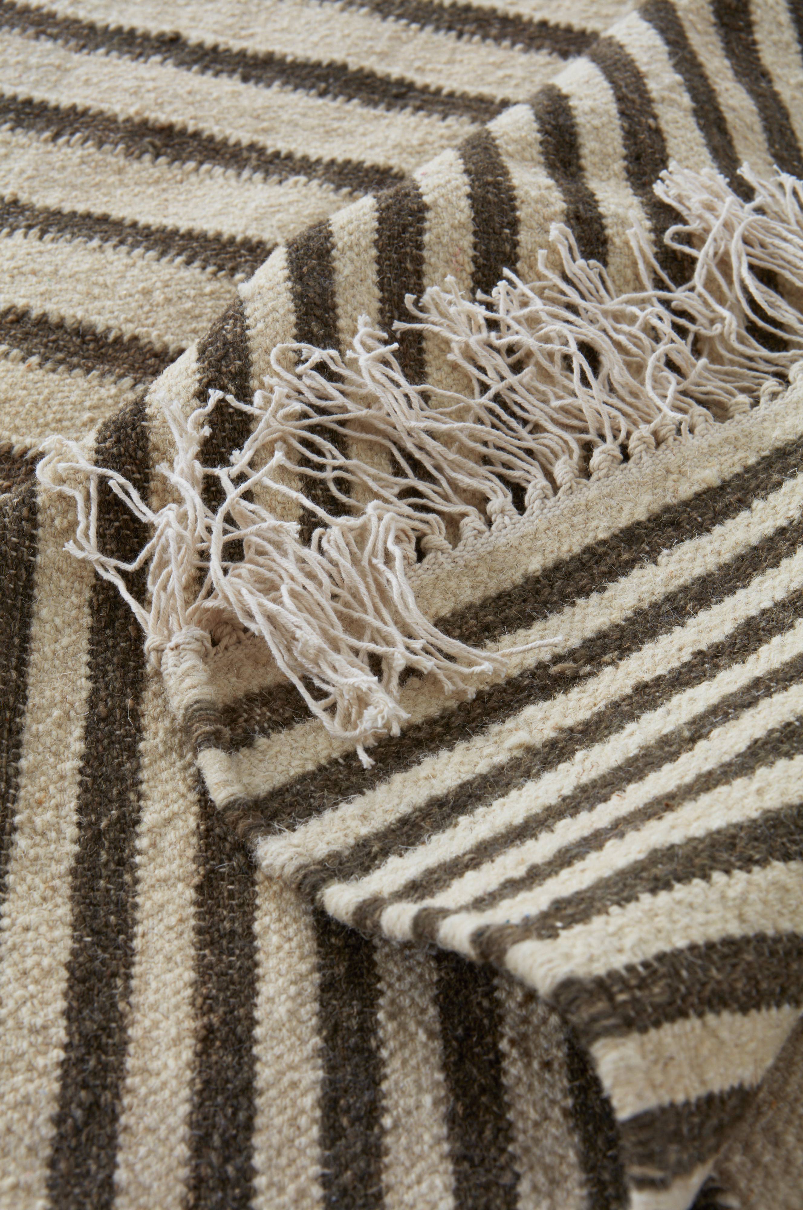 Håndvævet kelimtæppe af uld og bomuld. Kelimtæppet er et glatvævet tæppe uden luv. AMOT er tofarvet med geometriskt stribemønster i kontrastfarver. Takket være væveteknikken er mønsteret ens på begge sider af tæppet. Kelimtæpper væves ofte i naturlige materialer og AMOT er af uld og bomuld. Uld er et praktisk valg, da det er naturligt smudsafvisende. Det kontrastrige mønster er også taknemmeligt idet det kan skjle krummer og andet, og pletter ses ikke så tydeligt. AMOT er et tæppe som både kan bruges både under spisebordet og i dagligstuen. Tæppet er desuden nemt at ryste takket være den smidige kvalitet. Tæppet har lange frynser i enderne. Længde på frynser 10 cm. Tykkelse 0,5-0,6 cm. 1200-1400 g/m².