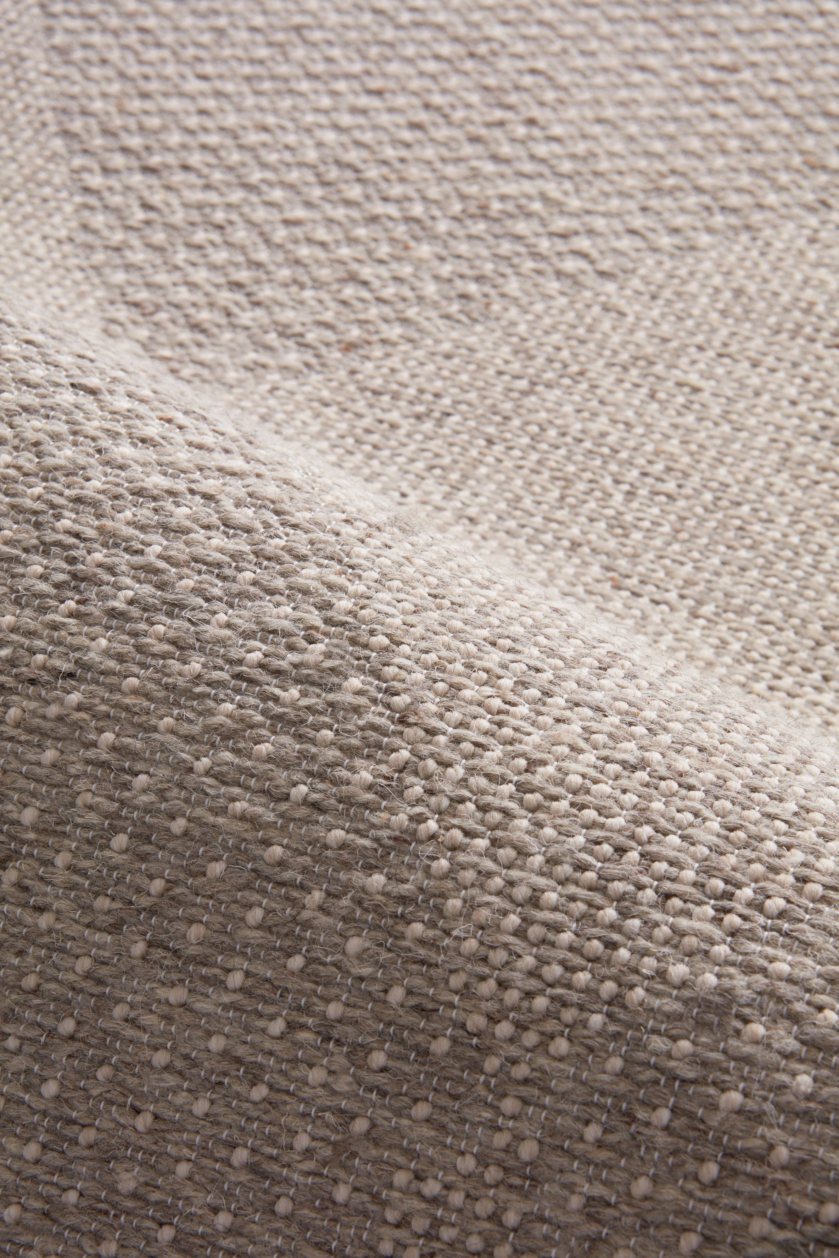 Glatvævet tæppe i en blanding af polypropylen, uld og polyester. Tæppet har et naturligt look med små detaljer og struktur som præger tæppets stil. Tæppet har diskret, vævet mønster som set far afstand skaber et rombemønster mens det tæt på giver tæppet en meleret karakter. Tykkelse 0,5 cm. 1450 g/m².