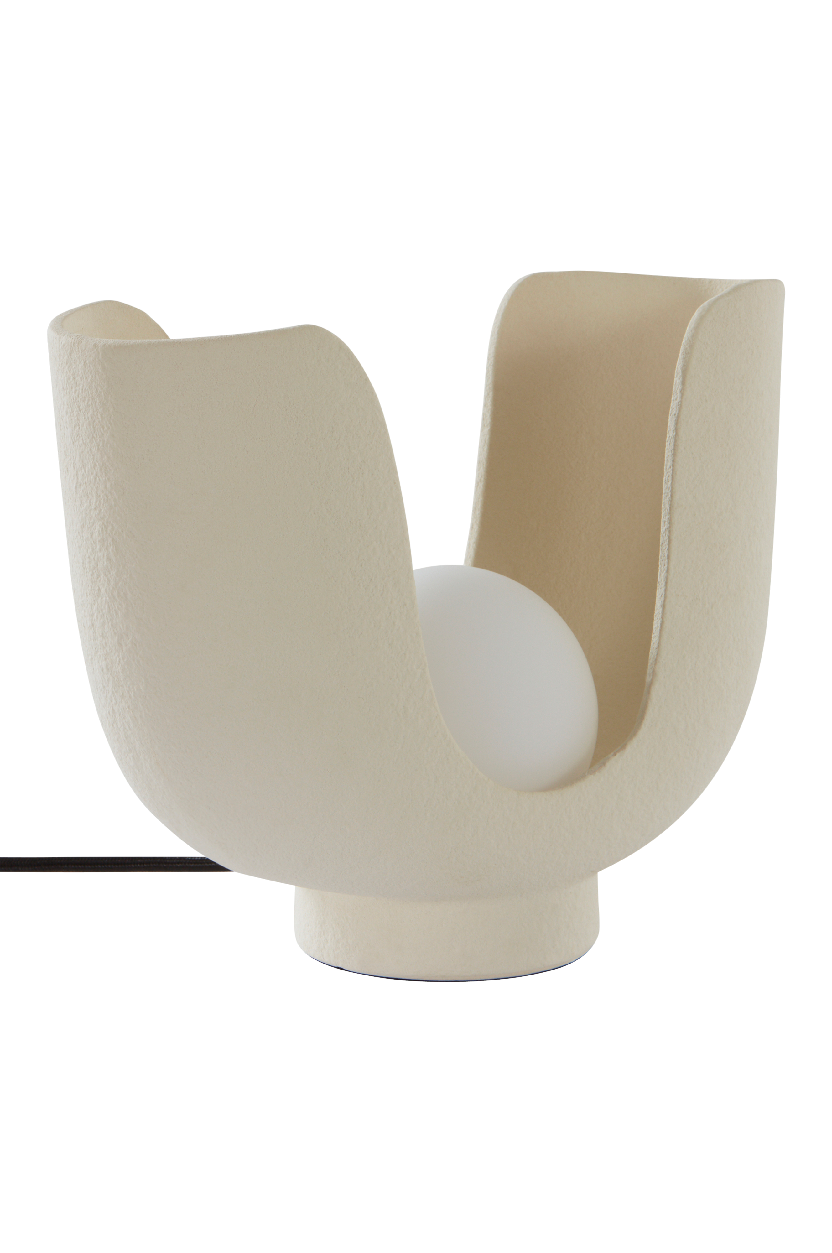 Bordlampe af keramik i lækker form med rund kugle af hvidt opalglas. Lampen giver et hyggeligt, indirekte skær, og lyset spreder sig forskelligt alt efter, hvilken retning du ser lampen fra. Sort stofledning løfter lampen en niveau. Afbryder på ledningen.