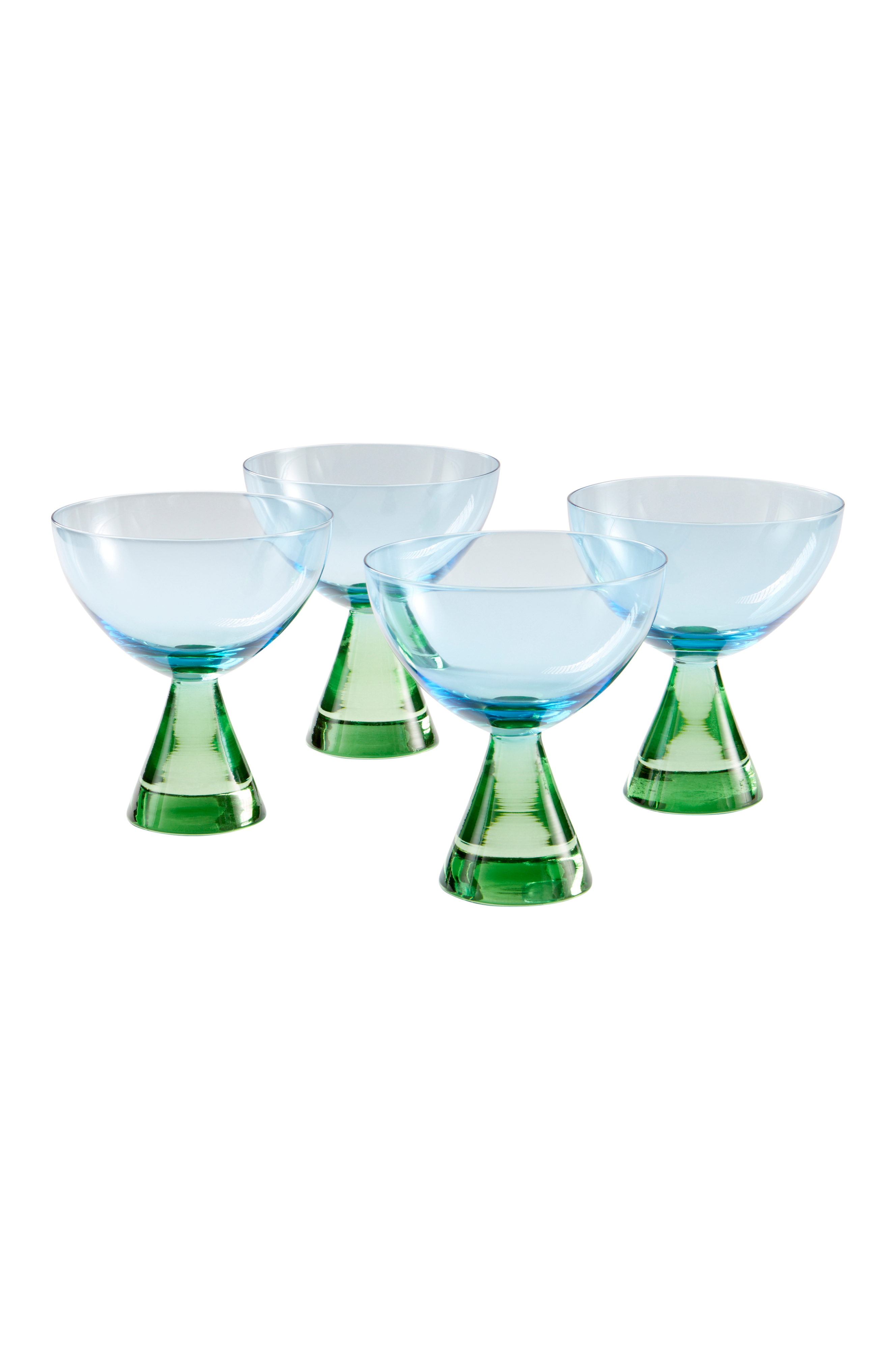 4-pak cocktailglas på fod. Det lækre glas AYLA kommer i to sommerlige farvekombinationer og formen er tiltalende. Både boblende drinks og cocktails smager forfriskende godt i et glas som dette, og borddækningen får et skønt look. Til sommerens garden party er AYLA et must.