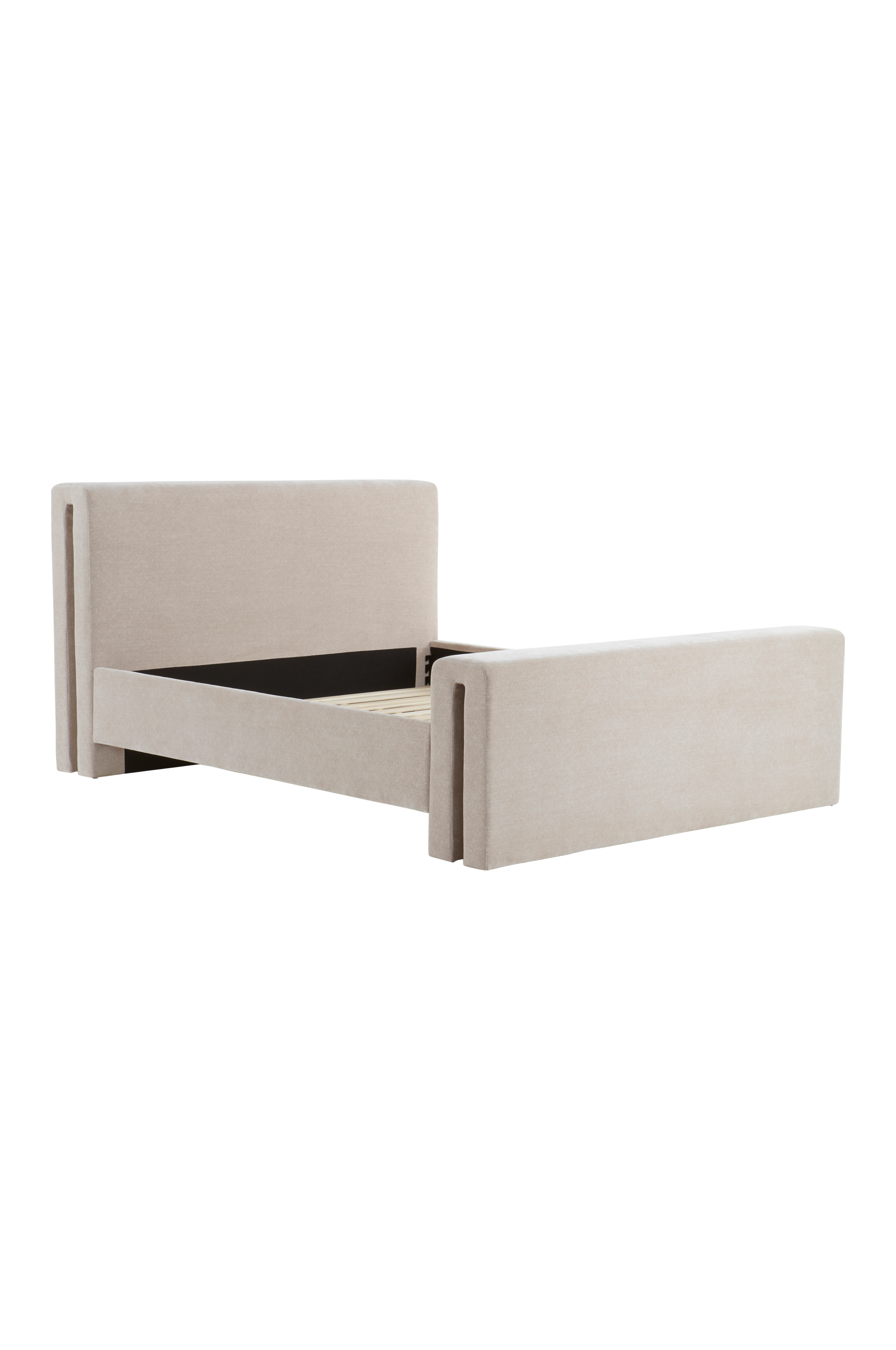 Storslået og luksuriøs sengeramme, der fylder og selvfølgelig er i fokus i dit soveværelse. Hovedgavlen er dobbeltbukket i et helt specielt design, ligesom fodgavlen. En fin detalje skabes ved, at enderne har en effektiv åbning et lille stykke ind i bukningen set fra siden, en lækker 3D-effekt. Sengerammen er betrukket med fint chenillestof af polyester og stellet er behageligt polstret og blødt. Stoffet har en slidstyrke på 20000 Martindale. Det er rart at sidde og læse i sengen, lænet op ad det bløde ryglæn. Fodgavlen er behagelig at sidde på. Stellet er af fremstillet af FSC-certificeret fyrretræ og plywood. Sengerammen har lamelbund i fyrretræ, og du supplerer med madrasser eller springmadrsser, alt efter hvad du foretrækker. Madras/springmadras medfølger ikke. Skal færdigsamles. Samlevejledning medfølger.