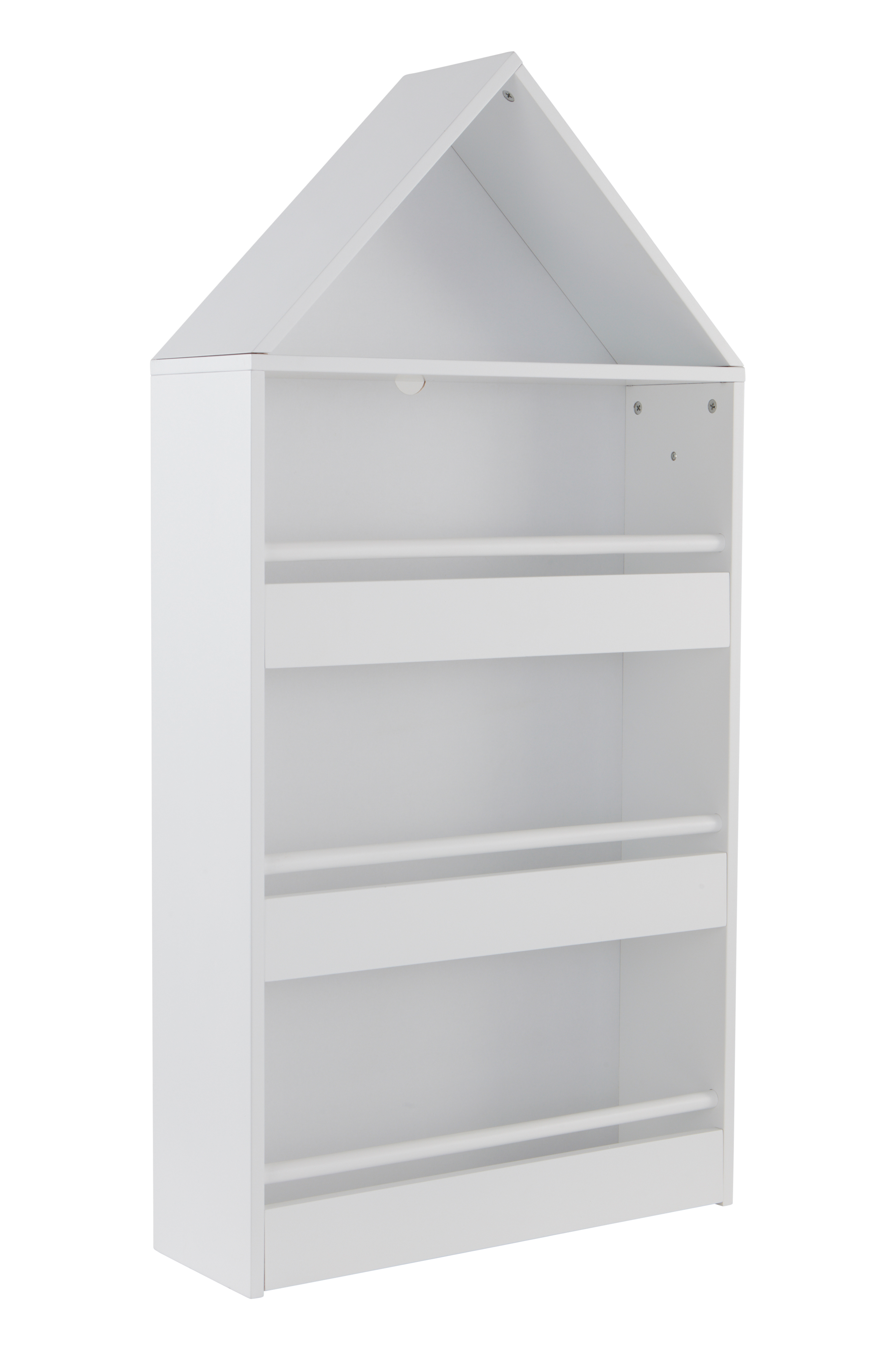 Børnereol af FSC-mærket MDF som er malet med vandbaseret farve. Den charmerende, husformede reol inspirerer til leg og læsning med fire faste hylder, hvor legetøj og bøger kan deles. Træknagen på den ene side er velegnet til at hænge badekåben, yndlingstrøjen eller rygsækken på. Vægbeslag medfølger. Nogen montering kræves. Samlevejledning medfølger.