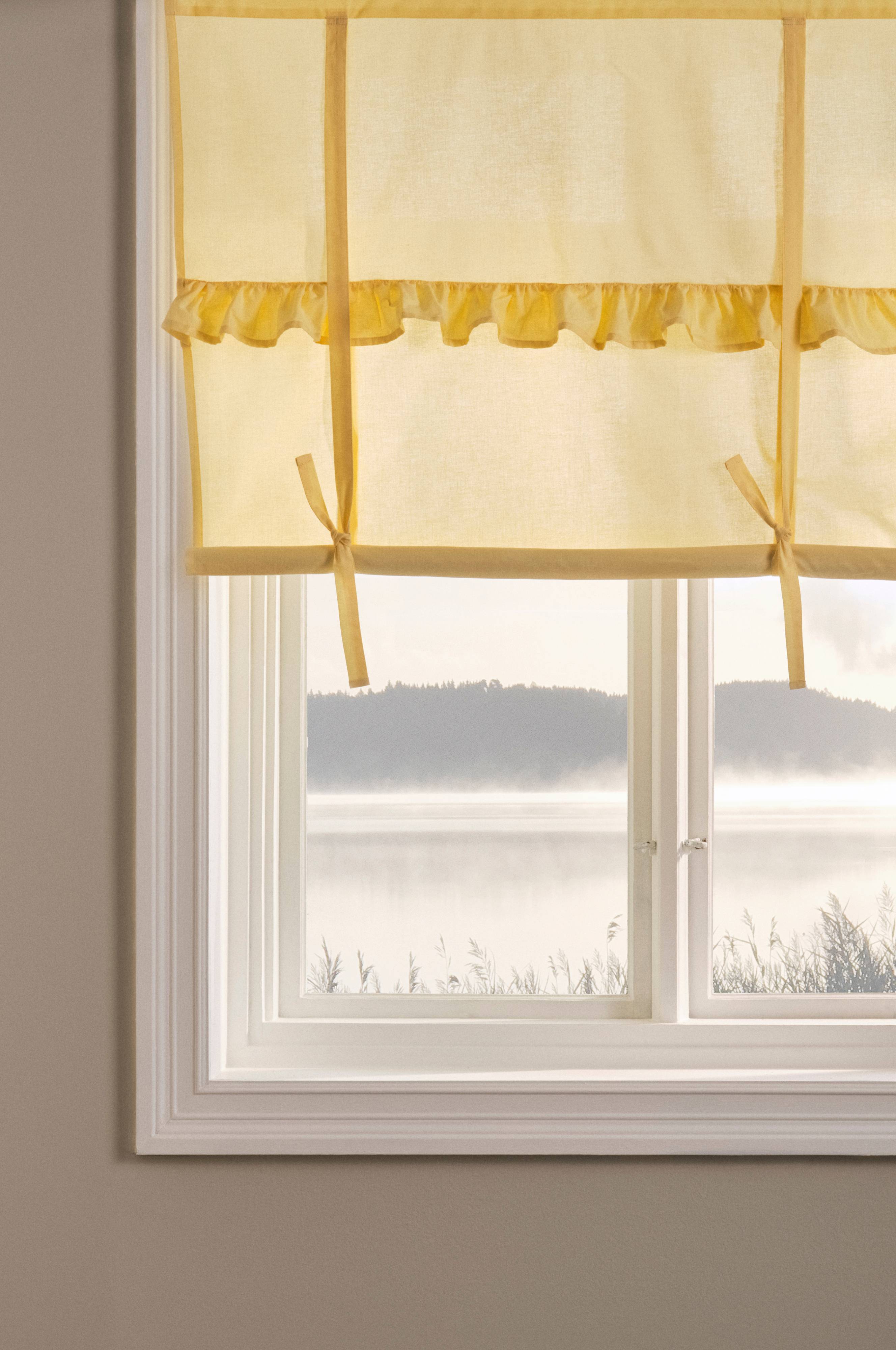 Roll up-gardin af økologisk bomuld. BILLY er et ensfarvet gardin med dekorative flæsedetaljer. Hænges på almindelig gardinstang. Højden reguleres med bindebånd.