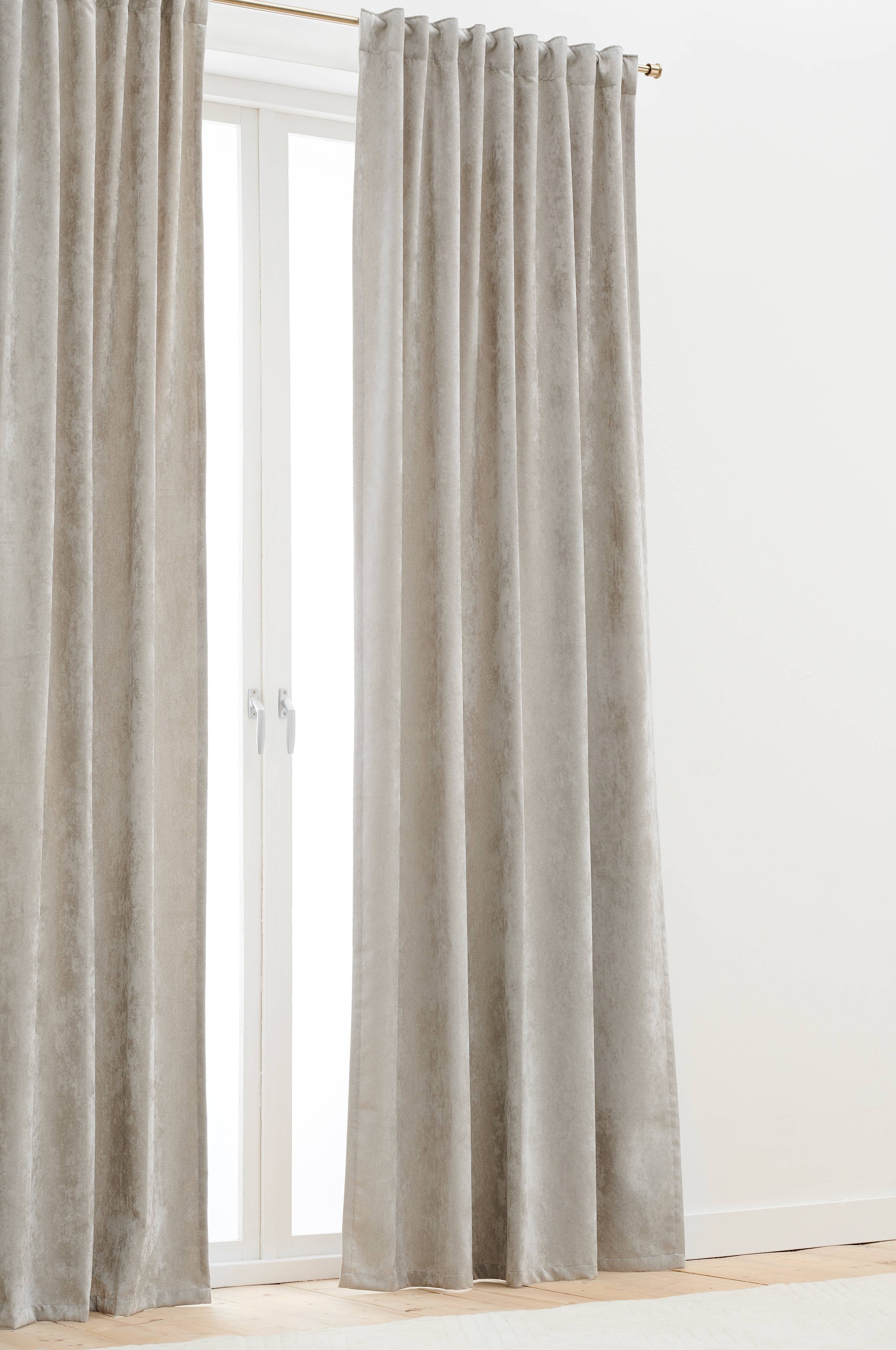 2-pak ensfarvede gardinlængder i polyesterblanding med påsyet multifunktionsbånd. Gardinet kan hænges op med fingerhægter, løbegang samt skjult strop.