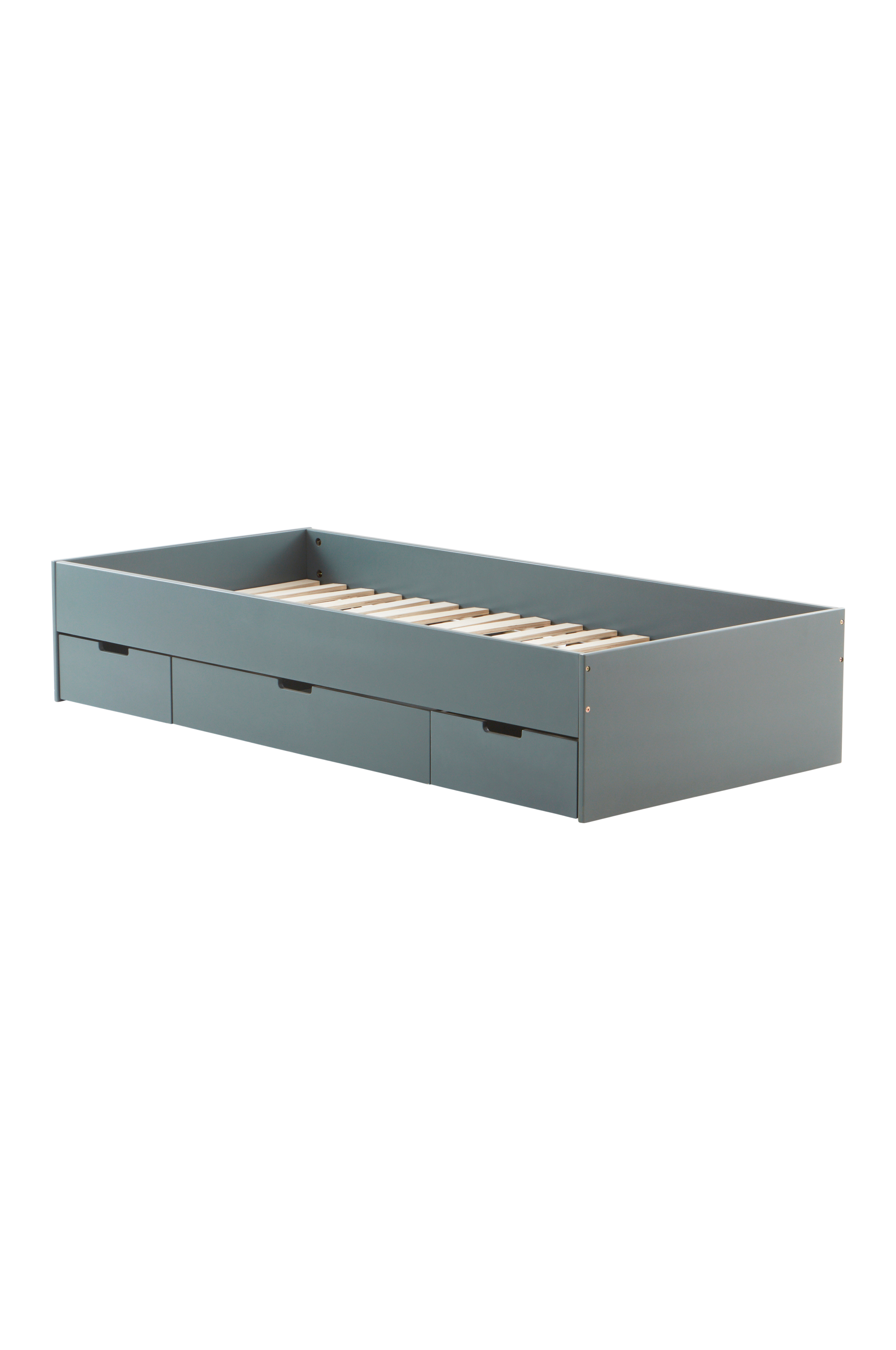 Børneseng af FSC-mærket MDF og spånplade. CACERE er på mange måder en praktisk seng. Under sengen er der tre rummelige skuffer til opbevaring. Sengen har en lidt højere kant og afhængigt af, hvor tyk madras du bruger, får sengen en lille kant, som gør at barnet ikke falder så let ud af sengen. Sengen er malet med vandbaseret maling. Madrassen hviler på en lamelbund. Anvendes til madrasmål 90x200 cm. Madras medfølger ikke. Nogen montering kræves. Samlevejledning medfølger.