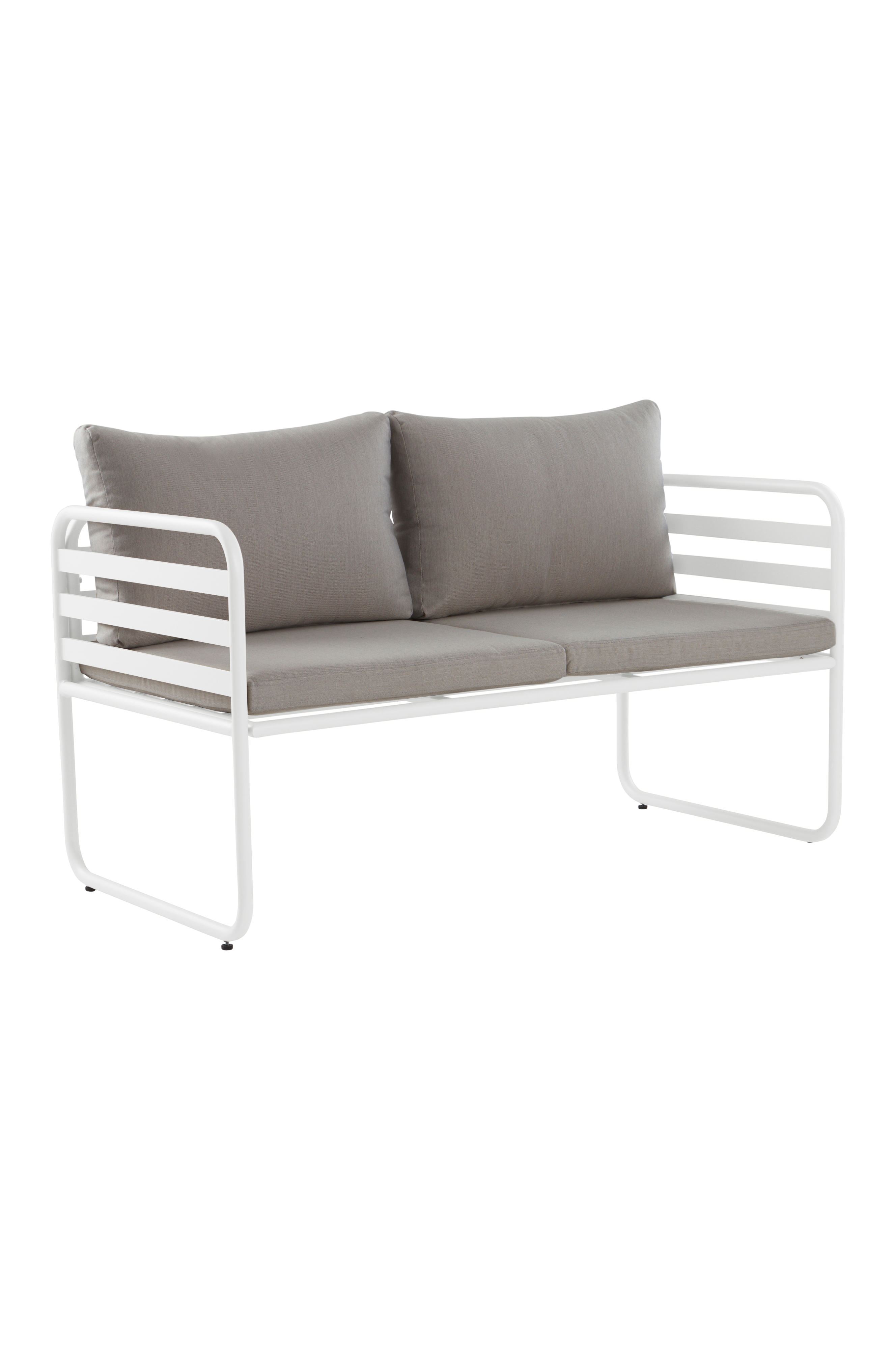 Loungesofa fremstillet i aluminium med pulverlakeret overflade. CADIZ er en pæn og fleksibel møbelserie til udendørs brug og tanken er, at du skal kunne møblere komfortabelt selv på et mindre areal. CADIZ er perfekt på altanen i byen eller på den lille terrasse uden for sommerhuset på landet. Designet er stilrent, hvor lige møder afrundet i en flot blanding. Sofaen har to blødt polstrede siddehynder og to behagelige ryghynder med polyesterbetræk. Betrækket er robust med slidstyrke på 30.000 Martindale. Aluminium er et praktisk materiale udendørs, som tåler vejr og vind, og som ikke ruster. Den matte farve gør, at metallet ikke blænder i sollys. Aftageligt betræk. Skal færdigsamles. Samlevejledning medfølger.