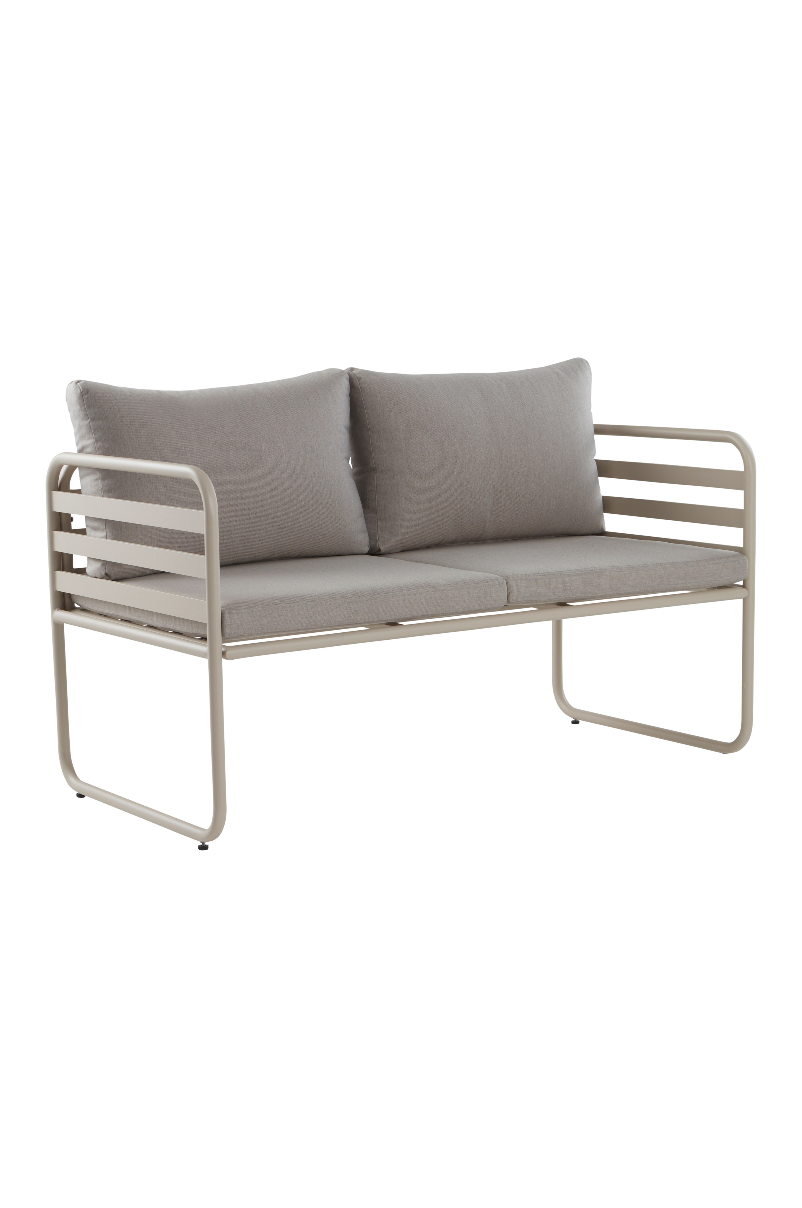 Loungesofa fremstillet i aluminium med pulverlakeret overflade. CADIZ er en pæn og fleksibel møbelserie til udendørs brug og tanken er, at du skal kunne møblere komfortabelt selv på et mindre areal. CADIZ er perfekt på altanen i byen eller på den lille terrasse uden for sommerhuset på landet. Designet er stilrent, hvor lige møder afrundet i en flot blanding. Sofaen har to blødt polstrede siddehynder og to behagelige ryghynder med polyesterbetræk. Betrækket er robust med slidstyrke på 30.000 Martindale. Aluminium er et praktisk materiale udendørs, som tåler vejr og vind, og som ikke ruster. Den matte farve gør, at metallet ikke blænder i sollys. Aftageligt betræk. Skal færdigsamles. Samlevejledning medfølger.