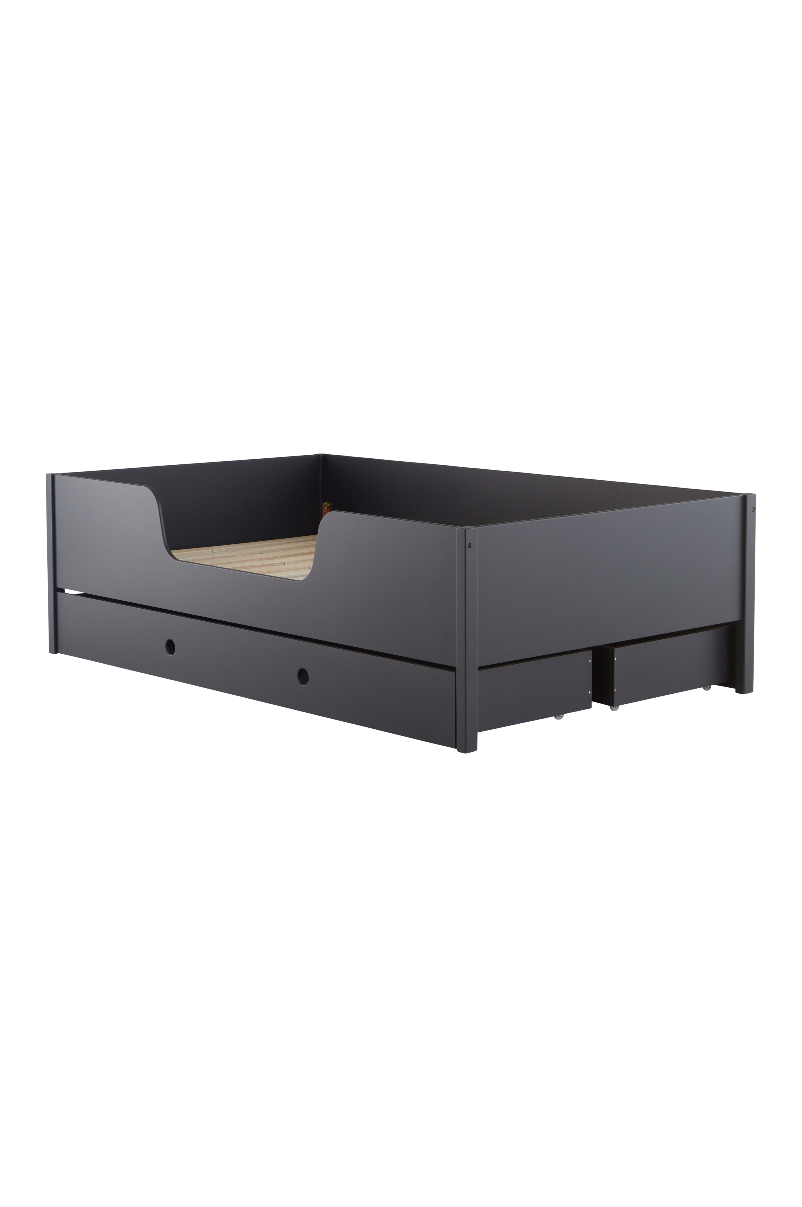 Sengen har en hyggelig ramme med høj kant hele vejen rundt. Den ene side har en sænket kant. Den har desuden praktisk opbevaring med to rummelige skuffer, der kører på hjul under sengen. Skufferne er lange og smalle og du trækker en ud i hver retning på sengen. Du kan nemt trække skufferne ud med hullerne som greb og du får praktisk opbevaring af legetøj, tøj og meget mere. Støtteben under sengen mellem skufferne. Skufferne er fritstående, og sengen fungerer lige så godt uden.