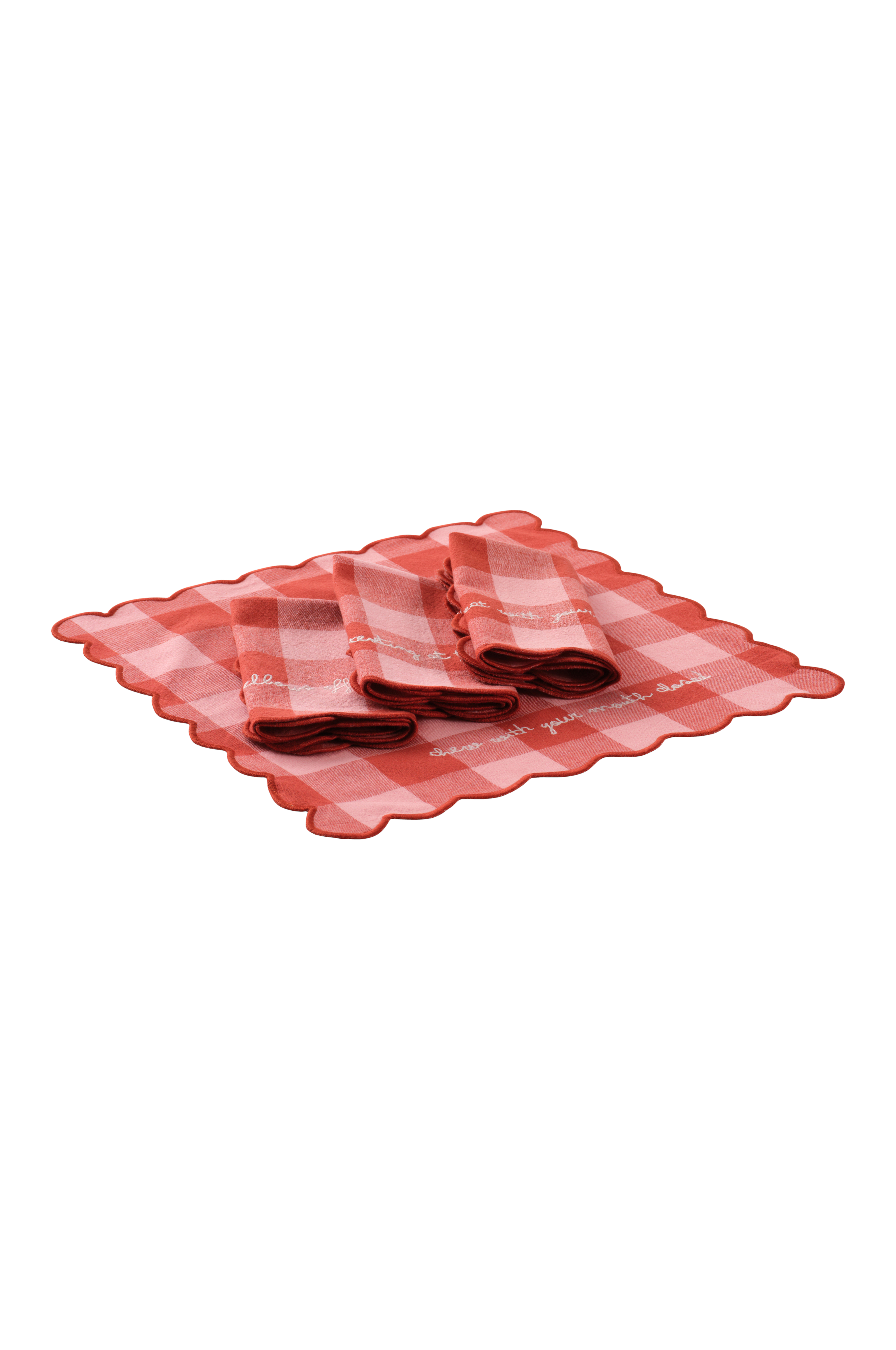 Serviettsættet CARLY er et modigt statement med bølgede kanter og detaljeret broderi. Dette sæt med fire servietter er fremstillet af garnfarvet, ternet bomuld og passer godt ind i moderne indretninger. De er en del af CARLY-familien og kan kombineres med matchende ting.
