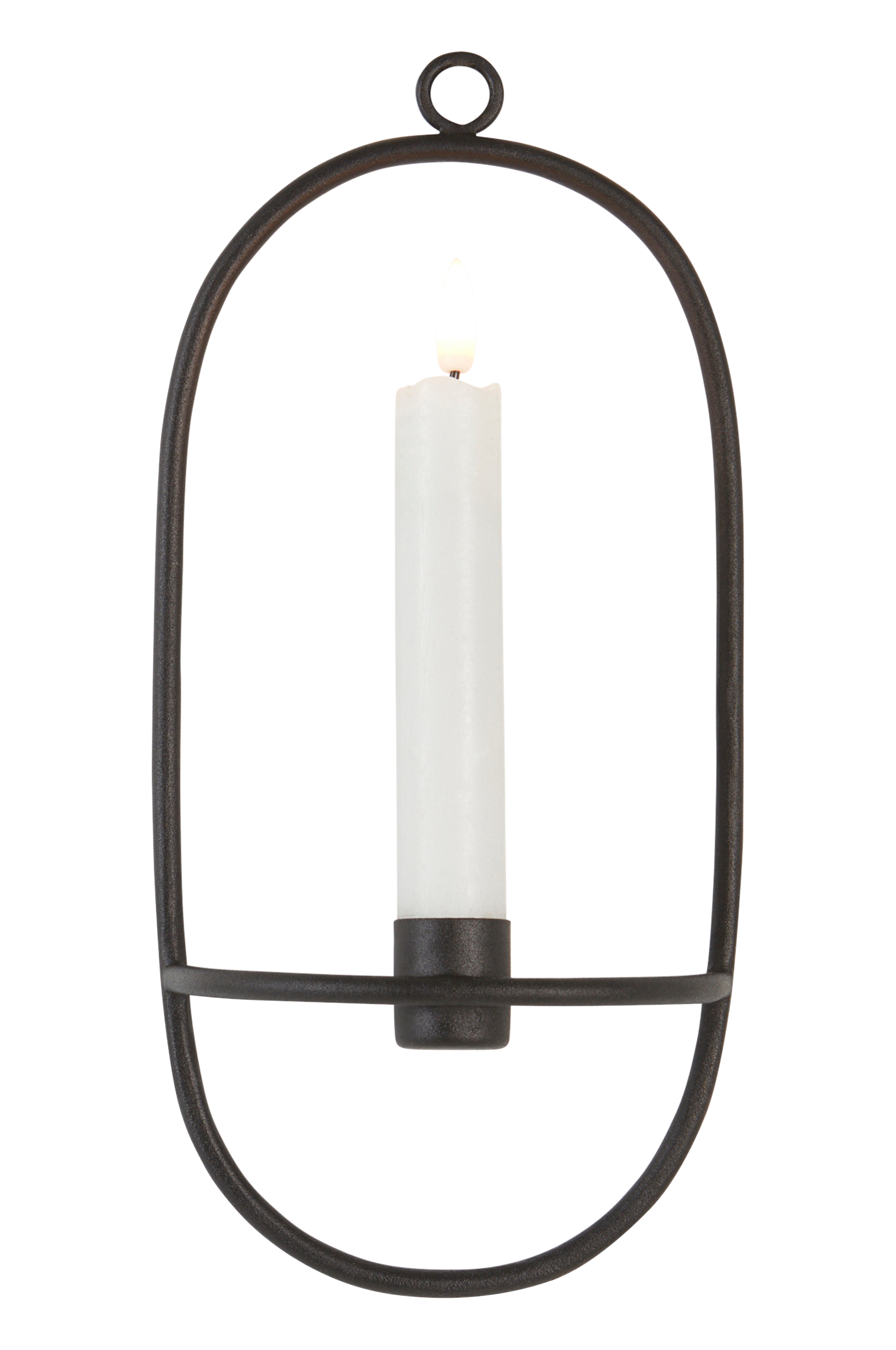 Oval væglysestage af jern med pulverlakeret overflade. Designet er enkelt og stilrent og giver høj hyggefaktor, når aftenerne bliver mørkere. Ringen foroven gør væglysestagen nem at hænge op. Lys medfølger ikke.
