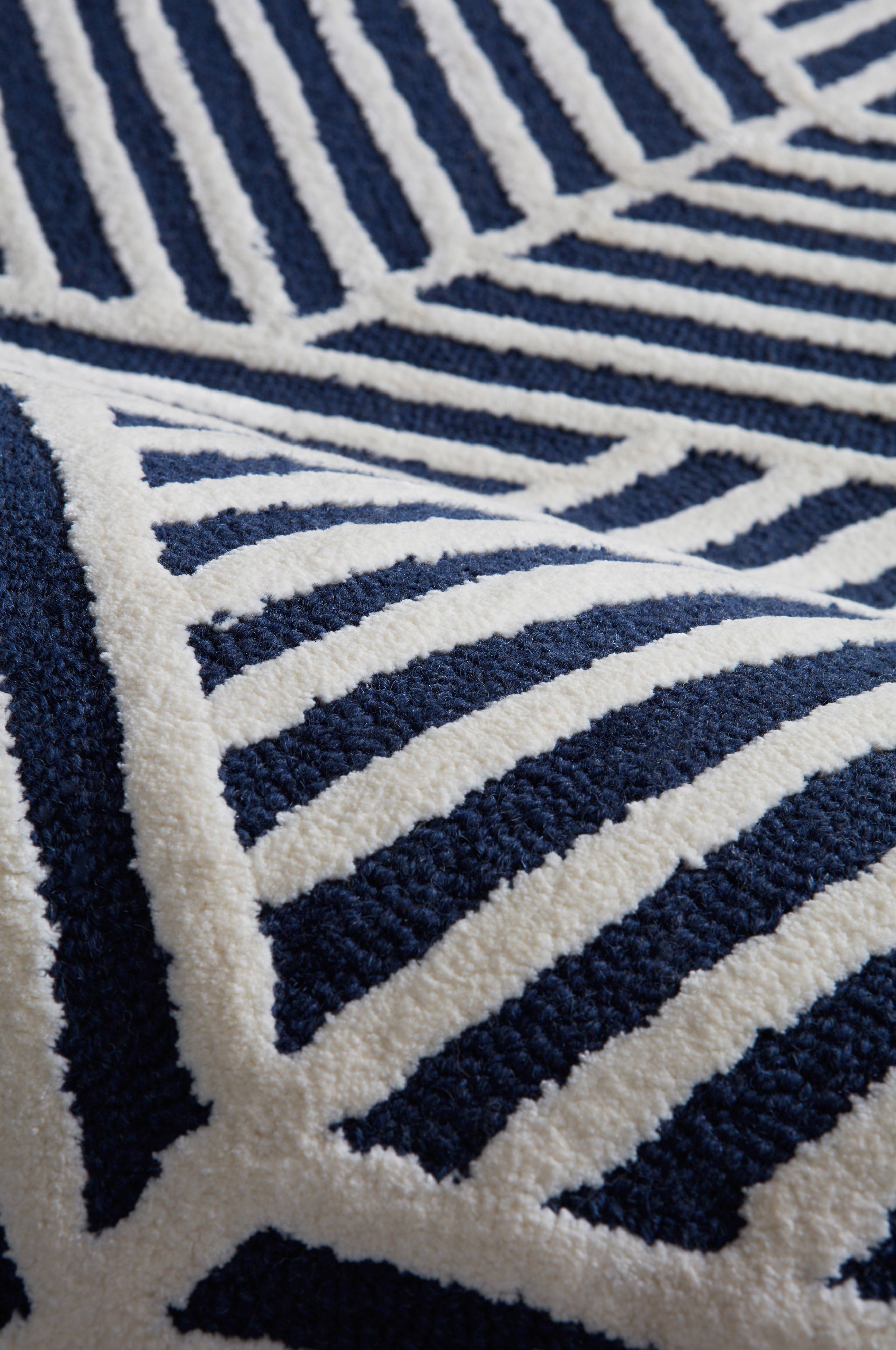 Håndtuftet luvtæppe af viskose. Det geometriske mønster af lyse og mørke striber har forskellig højde på luven, klippet luv kombineret med vævede løkker. En håndlavet tæppe er et fint håndværk og hvert tæppe er unikt. Luvhøjde stropper 0,5-0,6 cm, klippet luv 1-1,2 cm. Tykkelse 1,8-2 cm. 4400-4600 g/m².