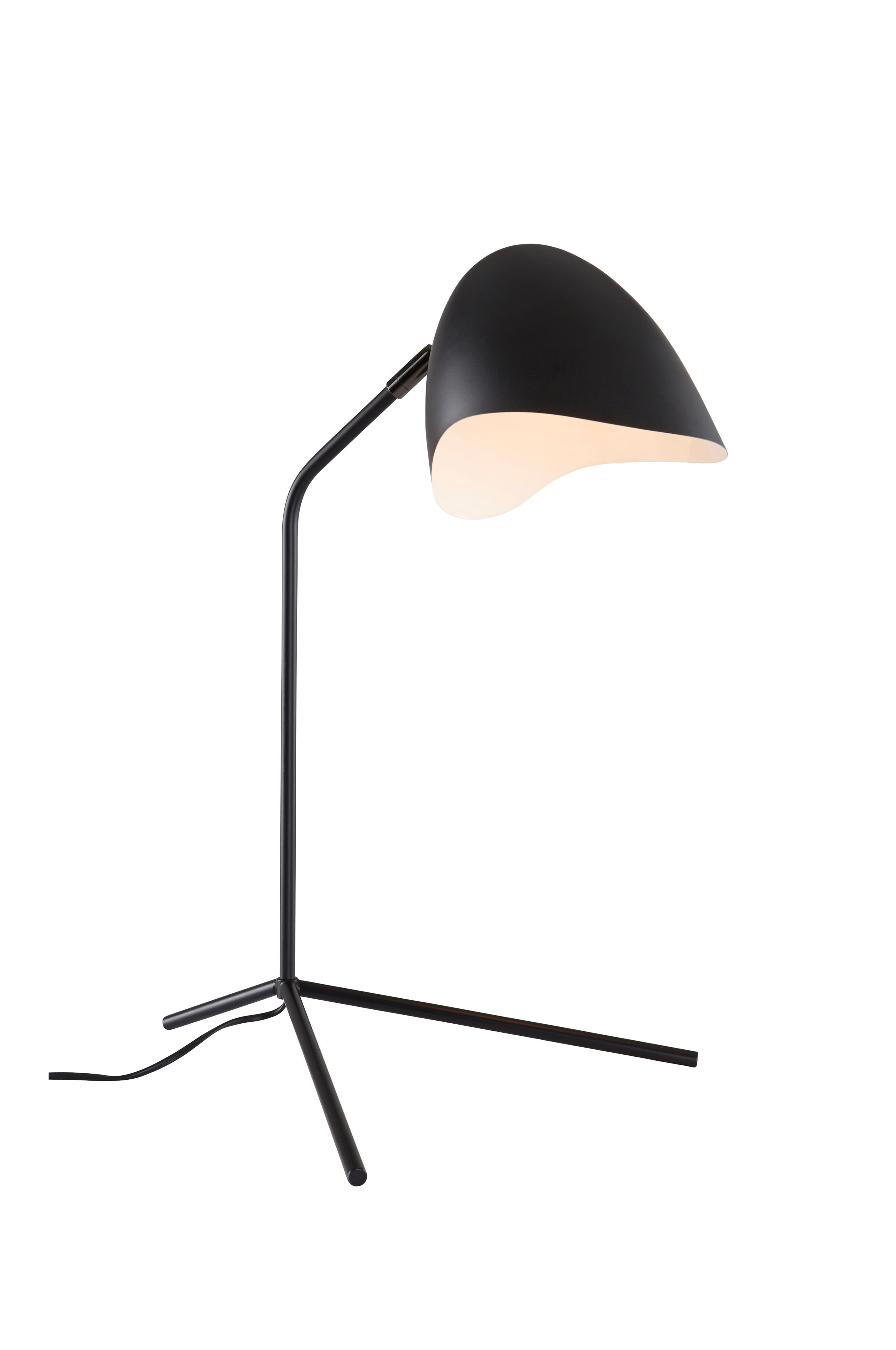 Bordlampe i matsort metal, skærmen har matsort yderside og blank, hvid inderside som reflekterer lyset fint. Den asymmetriske skærm kan drejes. Sort ledning, ledningslængde 1,5 m.