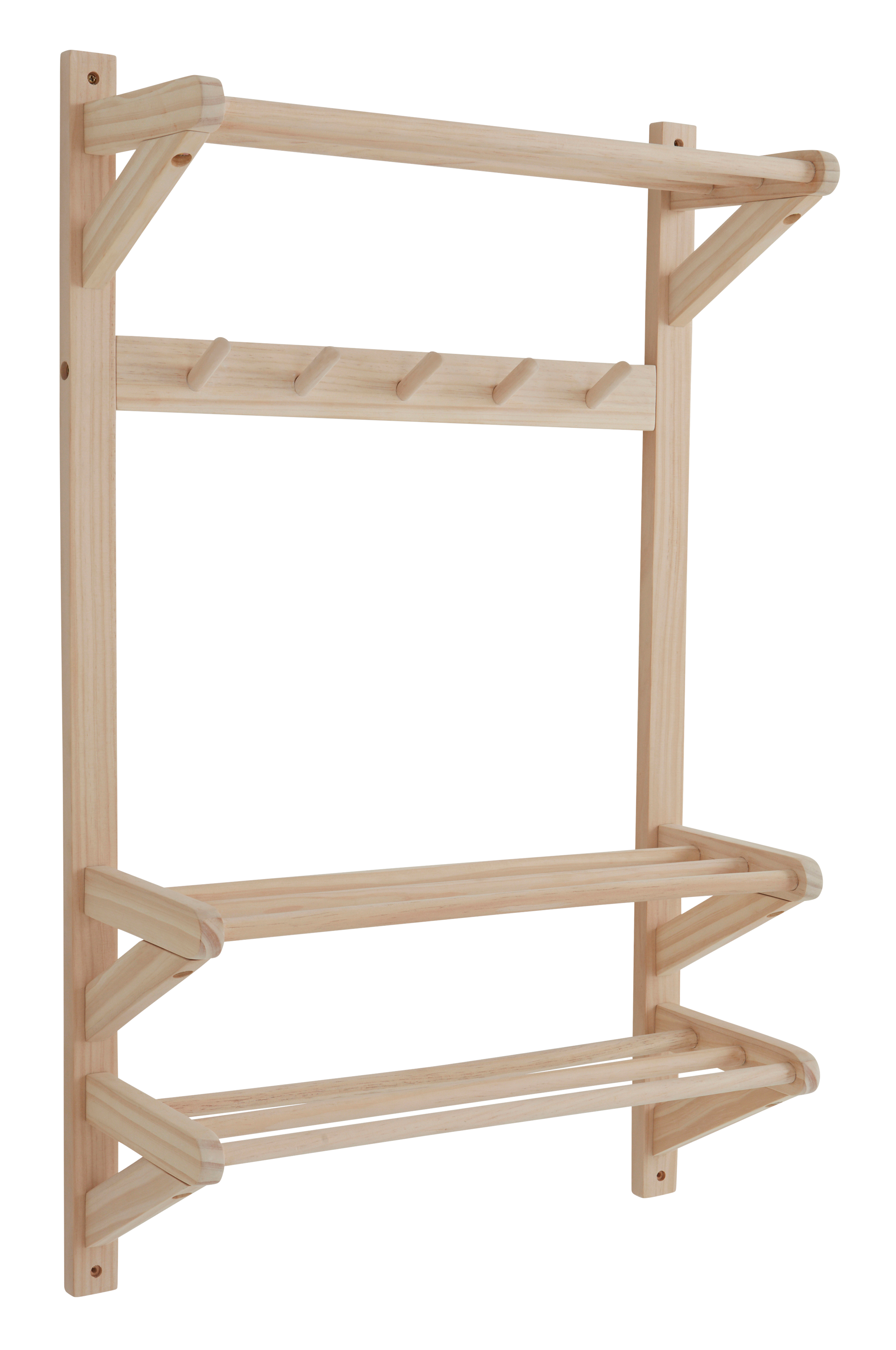 Tøjstativet COLE MINI er af FSC-mærket fyrretræ med sæbebehandlet overflade. Tøjstativet, der er tilpasset børn, har en hattehylde, en knagerække og to skohylder. Hylderne er af rundstave. Knagerækken har fem knager, som er vinklet opad, så tøj og tasker bliver hængende uden at glide af. Du kan hænge børnebøjler på den yderste rundstok på hattehylden (bøjler medfølger ikke). Tøjstativet skrues fast i væggen i den ønskede højde, så den hænger højt nok til børnene, så de nemt kan hænge jakken op og sætte skoene på skostativet. Skal færdigsamles. Samlevejledning medfølger.