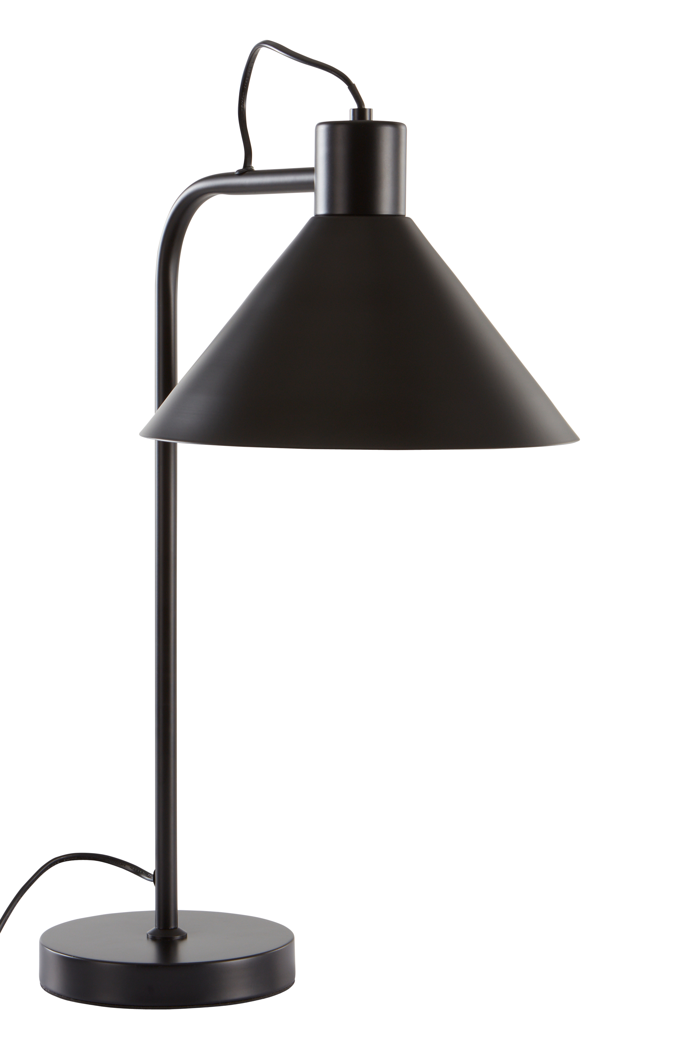 Bordlampe af jern som er malet matsort. Lampeskærmen har hvid inderside, der reflekterer lyset og spreder lyskeglen nedad, strømafbryderen er placeret langt nede på lampefoden. Ledningen har vægstik. Lampen er ujordet, klasse 2.