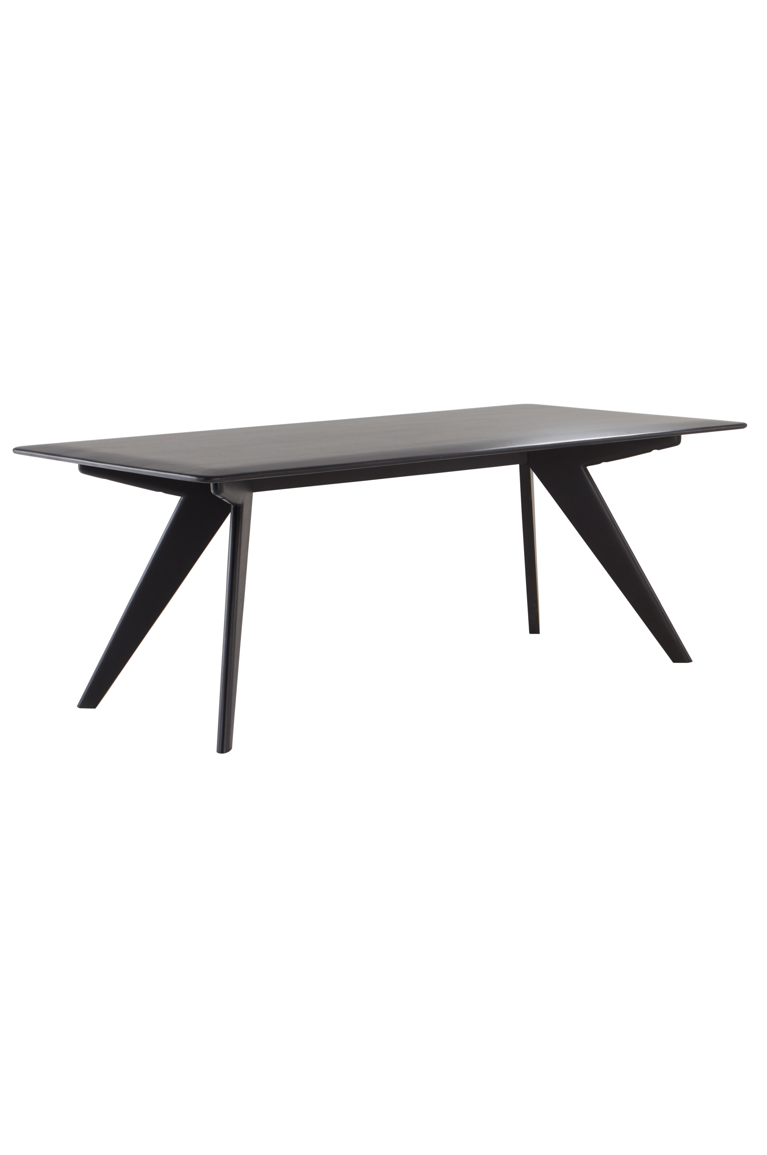 Rektangulært spisebord af massivt mangotræ. Den glatte bordplade har afrundede hjørner og en let buet yderkant hele vejen rundt, som leder tankerne hen på 60'erne. De flot formede ben forstærker retrostilen, og den praktiske placering af benene giver bedre siddeplads rundt om bordet.