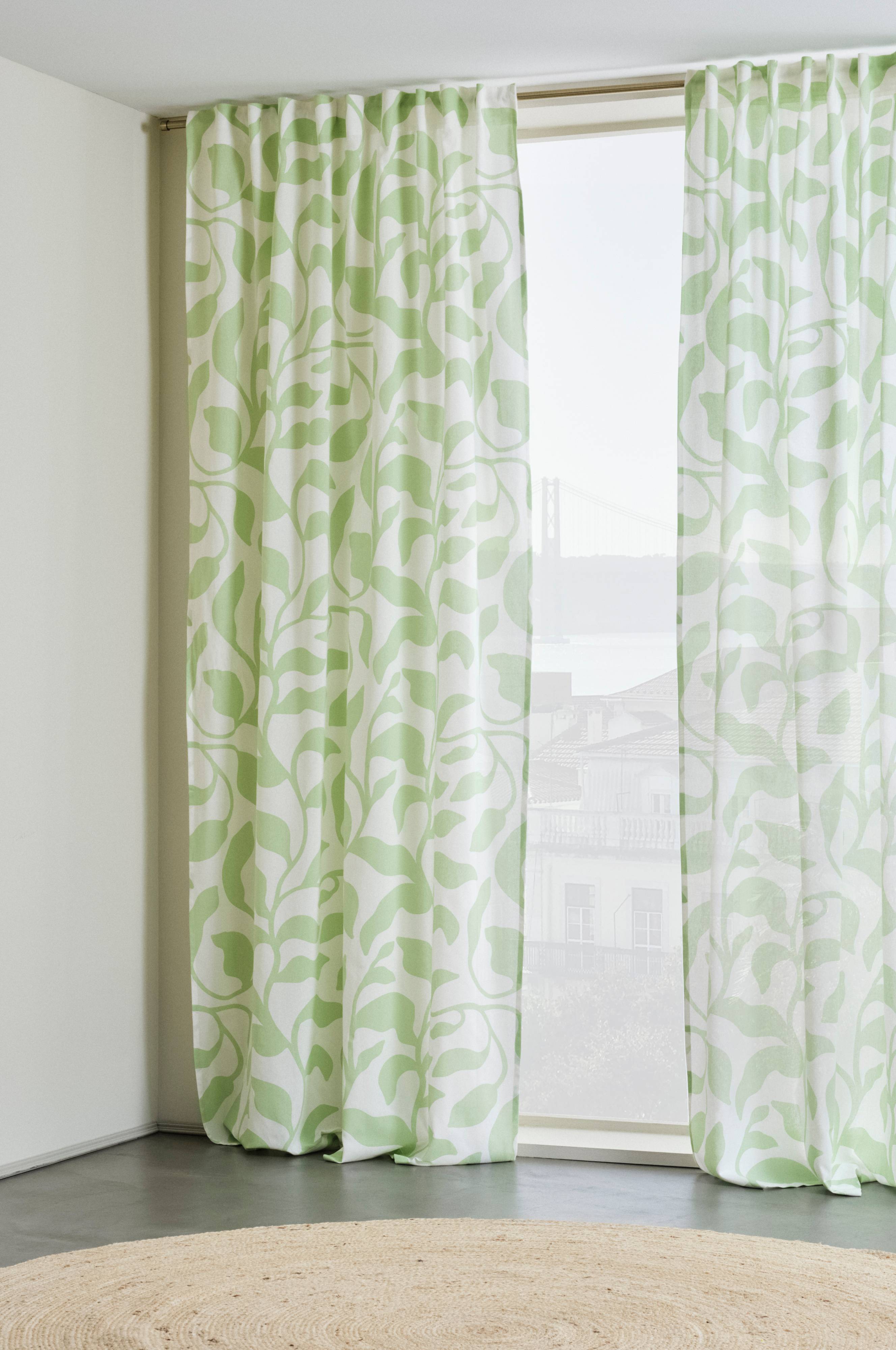 To gardinlængder i halvpanama af bomuld. Delene i serien DELLA har charmerende mønster med blade i sommerlig farve printet på hvid bund. DELLA har et påsyet multifunktionsbånd og gardinet kan hænges op med fingerhægter, løbegang samt skjult strop. Stoffets gramvægt er 170 g/m².