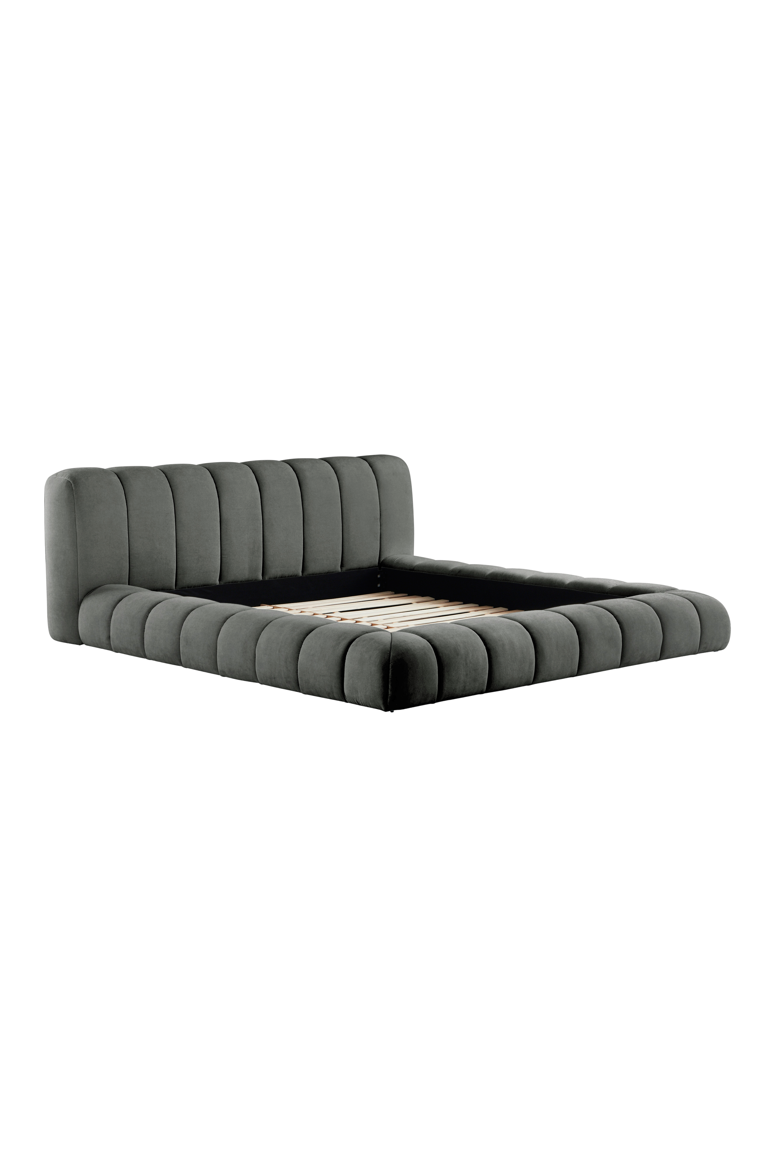 Sengeramme som er blød og rund i formen, meget overdådig og indbydende. Både hovedgavlen og rammen rundt om er blødt vatteret og betrukket med et neutralt ensfarvet polyesterstof, der er let at matche - lodrette sømme gør sengen rigtig flot. Rammen rundt om sengen går næsten helt ned til gulvet. Der er en lille sprække som gør, at luften kan cirkulere under sengen. Stellet er af fremstillet af FSC-certificeret fyrretræ og plywood. Sengerammen har lamelbund i fyrretræ, og du supplerer med madrasser eller springmadrsser, alt efter hvad du foretrækker. Madras/springmadras medfølger ikke.