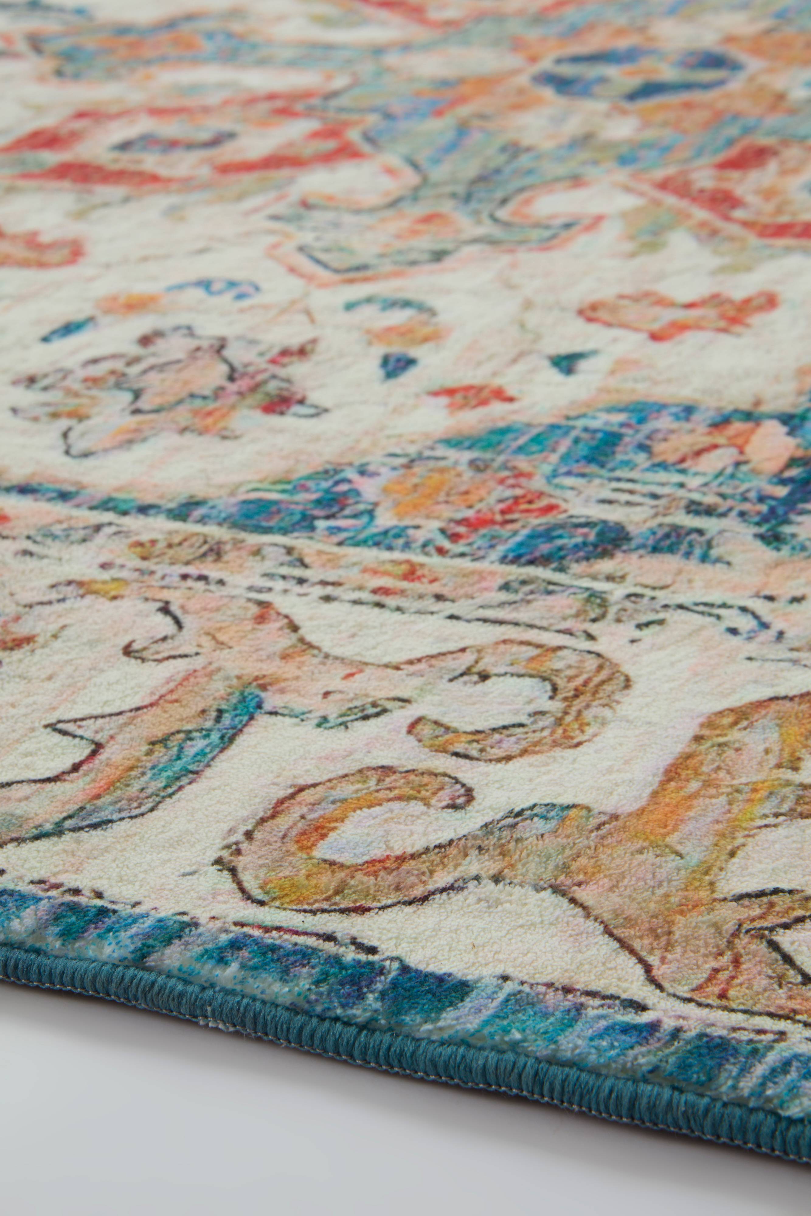 DINA-tæppet har et orientalsk inspireret mønster, der tilfører luksus til ethvert rum. Dette store, syntetiske tæppe har skridsikre prikker for sikkerhed og stabilitet. Dets indviklede design og livlige farver gør det til en fængslende tilføjelse til din boligindretning.
