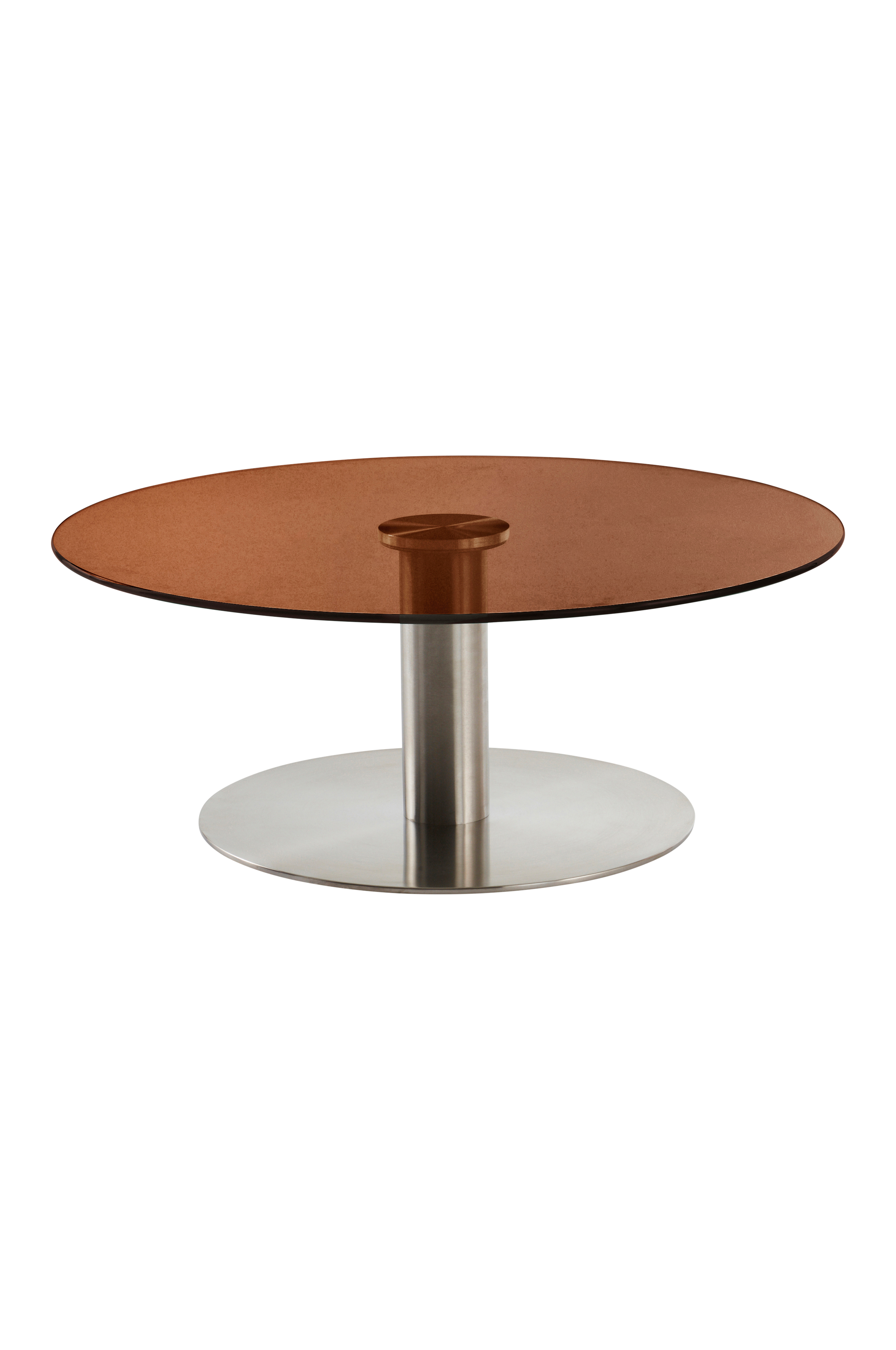 Rundt sofabord med bordplade af glas og søjlefod af rustfrit stål med børstet overflade. Foden er lige og stilren og harmonerer fint med glasbordpladen, hvor midtpunktet skaber et flot center ved at foden er synlig gennem glasset. Den lave højden på bordet giver skøn loungefornemmelse ved sofaen. Skal færdigsamles. Samlevejledning medfølger.
