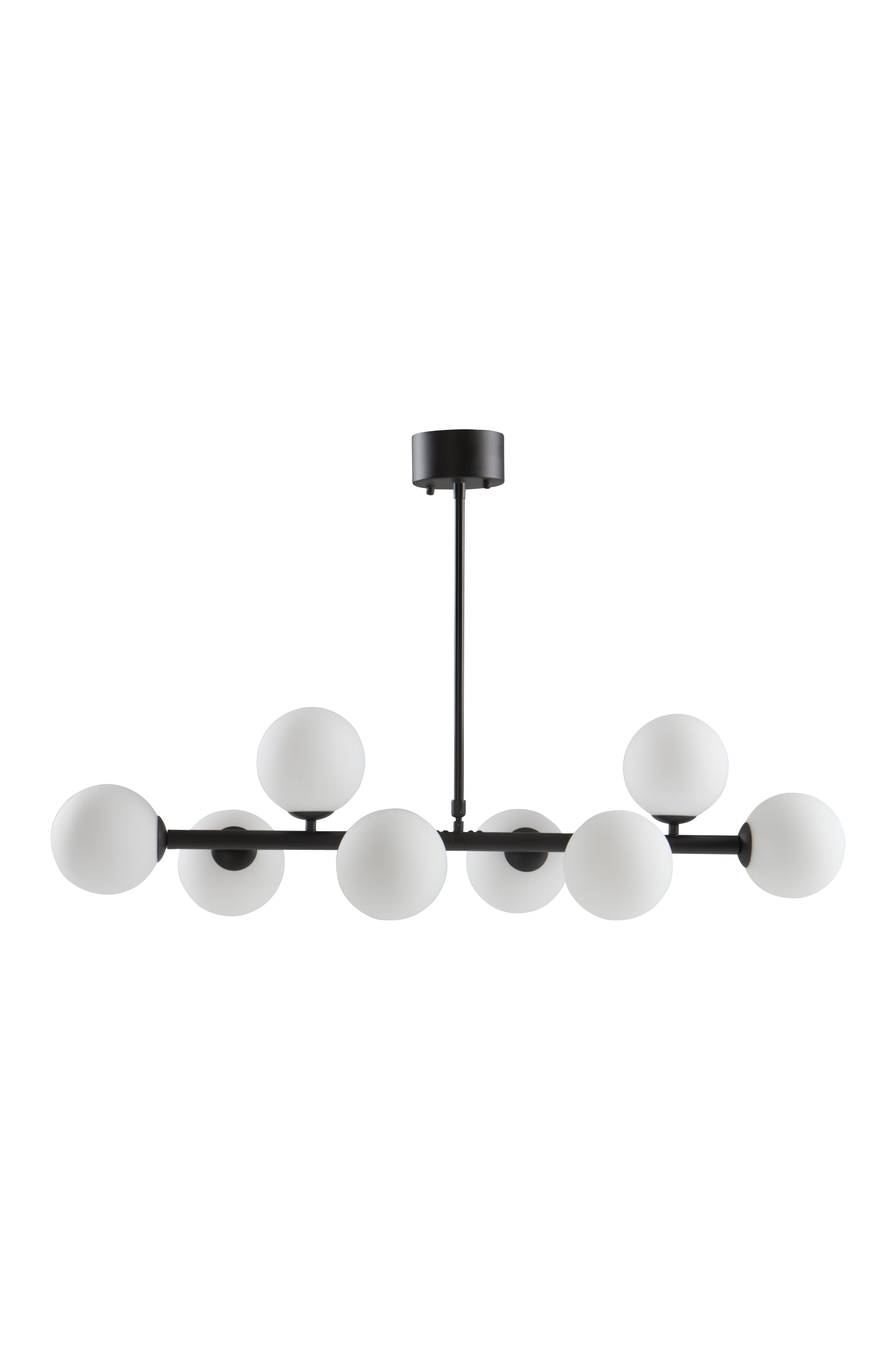 EKMAN-loftslampen blander klassisk elegance med moderne stil. Med otte opale glaskugler og en slank metalramme giver den et blødt, omgivende lys, der er perfekt til køkkener eller opholdsrum og forbedrer hjemmets overordnede æstetik.