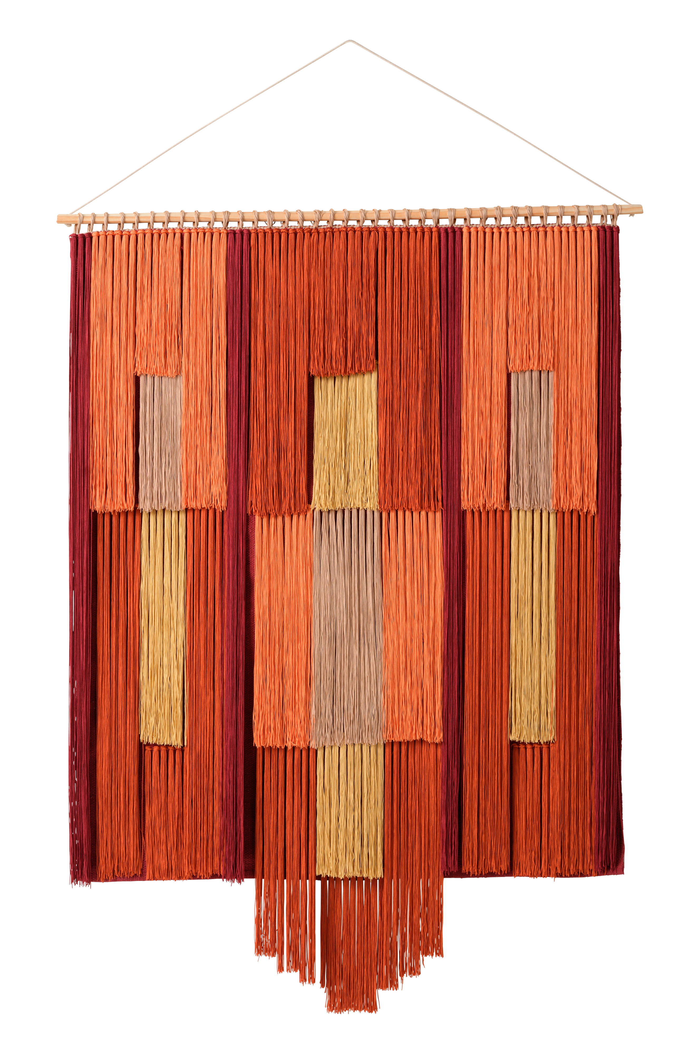 ELENA-vægophænget har dristige geometriske mønstre og et lagdelt frynsedesign. Det er håndlavet til dem, der elsker detaljer, og det giver rummene dybde og stil. Som en unik accent i hjemmet bliver den et samtaleemne og et dejligt fokuspunkt.