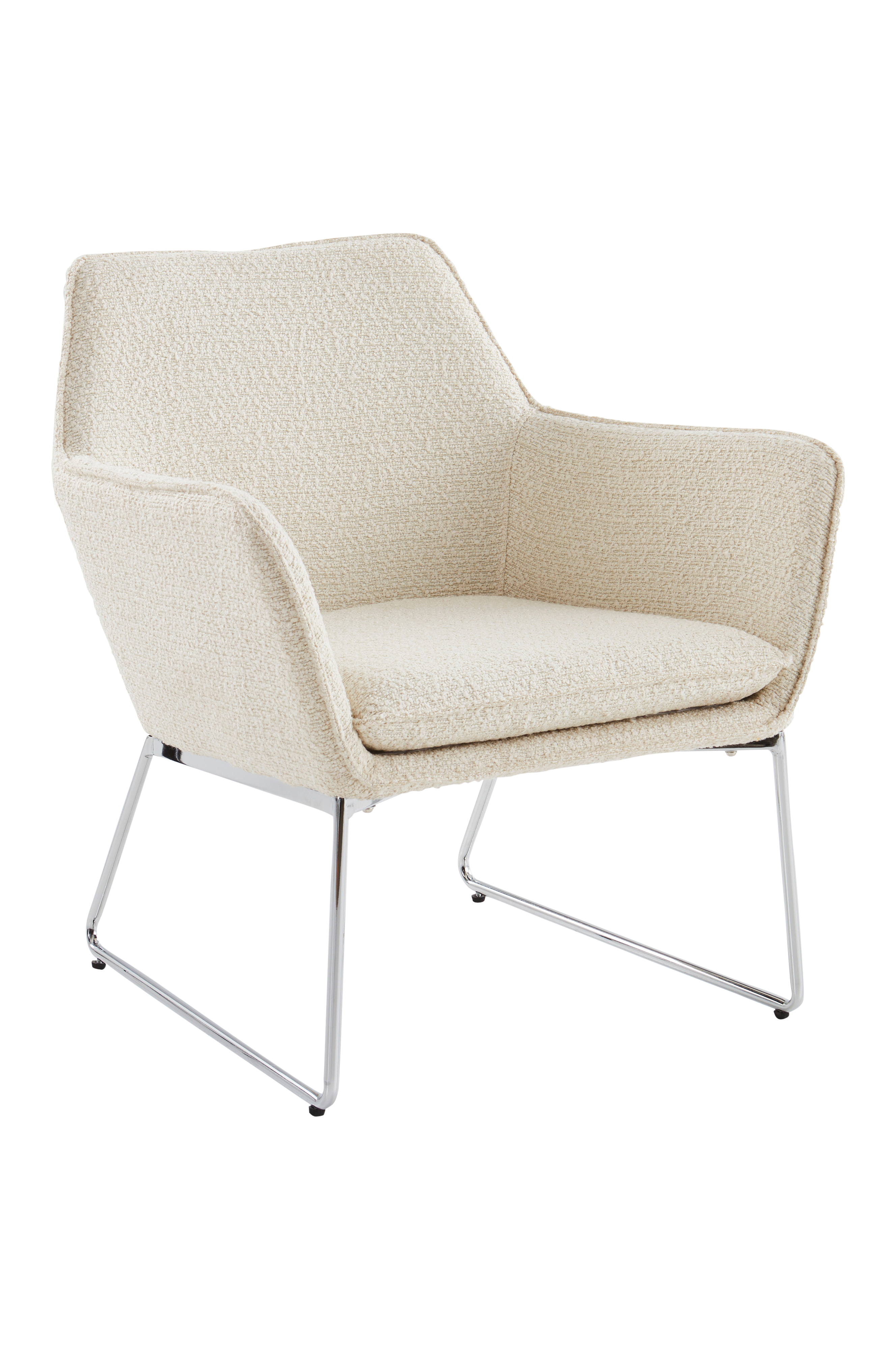 Ensfarvet lænestol som er beklædt i et lækkert boucléstof og har forkromede metalben. Behagelig, karakterstærk og let er ord, der beskriver ELLNE. Lænestolen er bekvem takket være sin siddevinkel, blødt vatteret ryg og den blød ehynde i boucléstof. Boucléstoffet er slidstærkt med slidstyrke på 40000 Martindale. Skal færdigsamles. Samlevejledning medfølger.