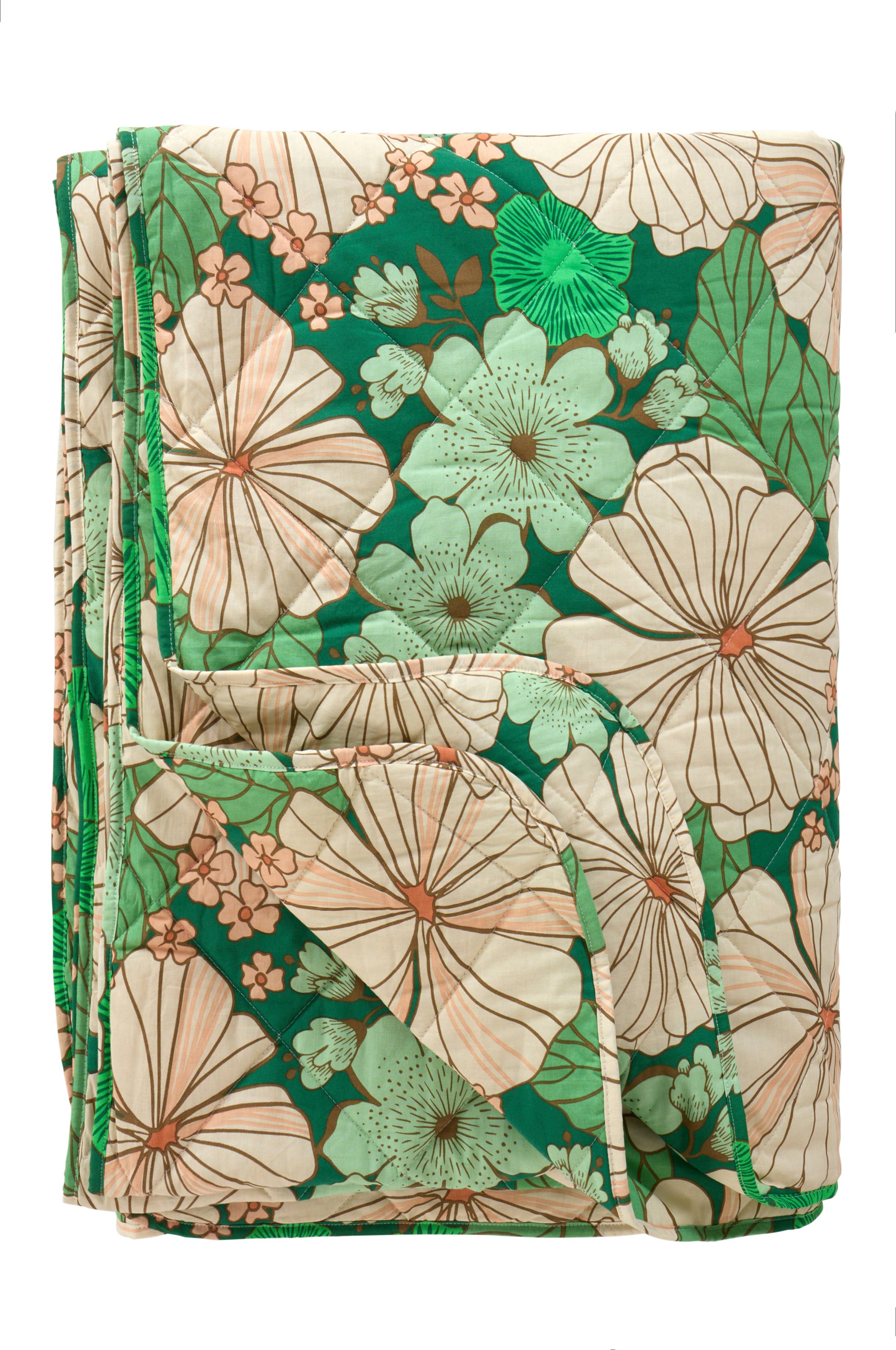 Sengetæppe i fintrådet, tætvævet bomuldskvalitet. Stoffet har et dejligt blomstermønster trykt i en flot farveskala, og det er quiltet, så det lette fyld bliver på plads. Det er også enzymvasket, hvilket giver en behagelig blødhed og en lidt slidt fornemmelse. Sengetæppet er vendbart med blomster på begge sider og kant hele vejen rundt.