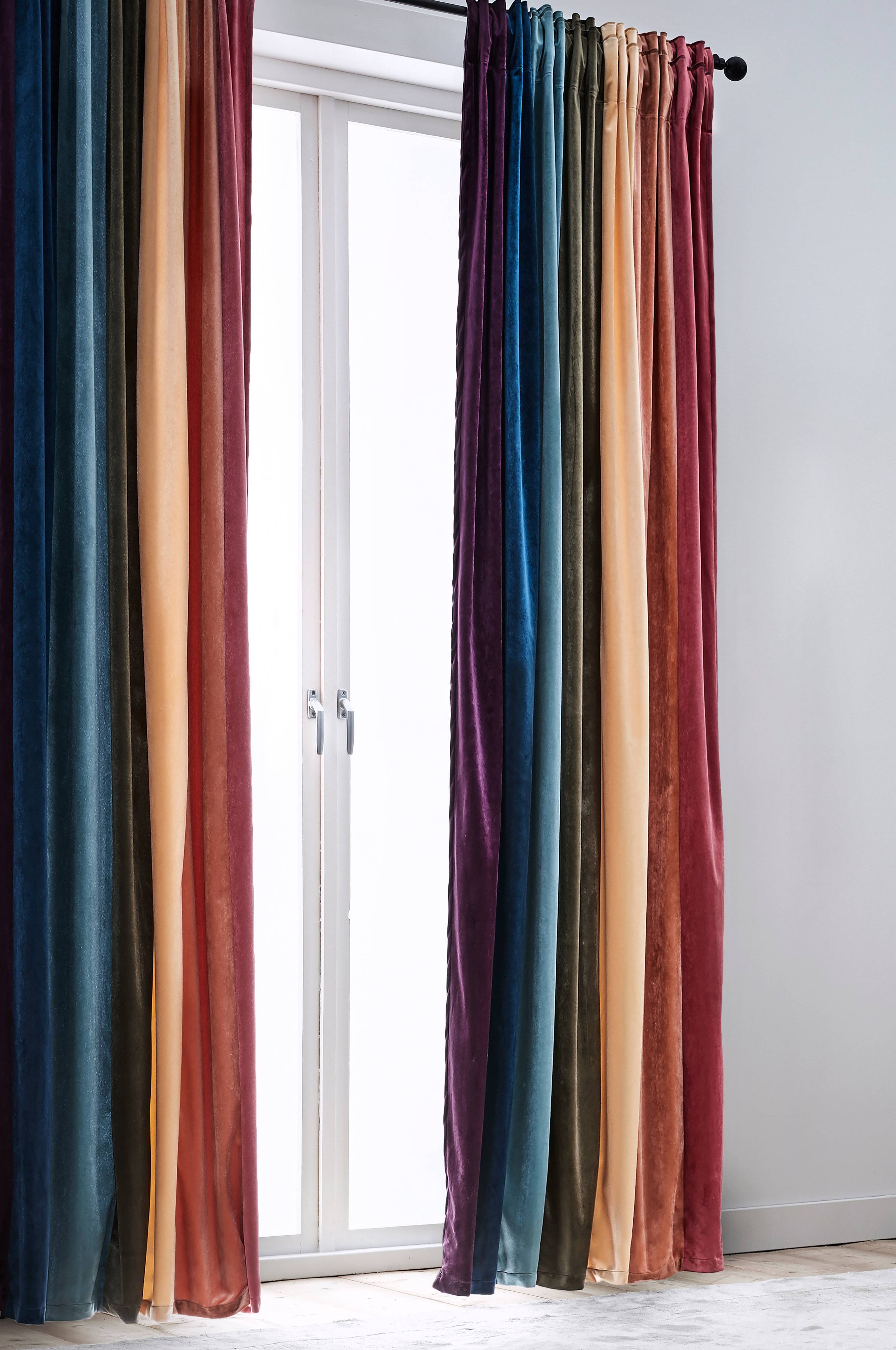 En stribet gardinlængde i velour. Velour i smukke farver syet sammen i lodrette striber med flot effekt. De skønne gardiner gør rummet ekstra efterårshyggeligt. Med påsyet multifunktionsbånd. Gardinet kan hænges op med fingerkroge, kanal samt skjult strop.