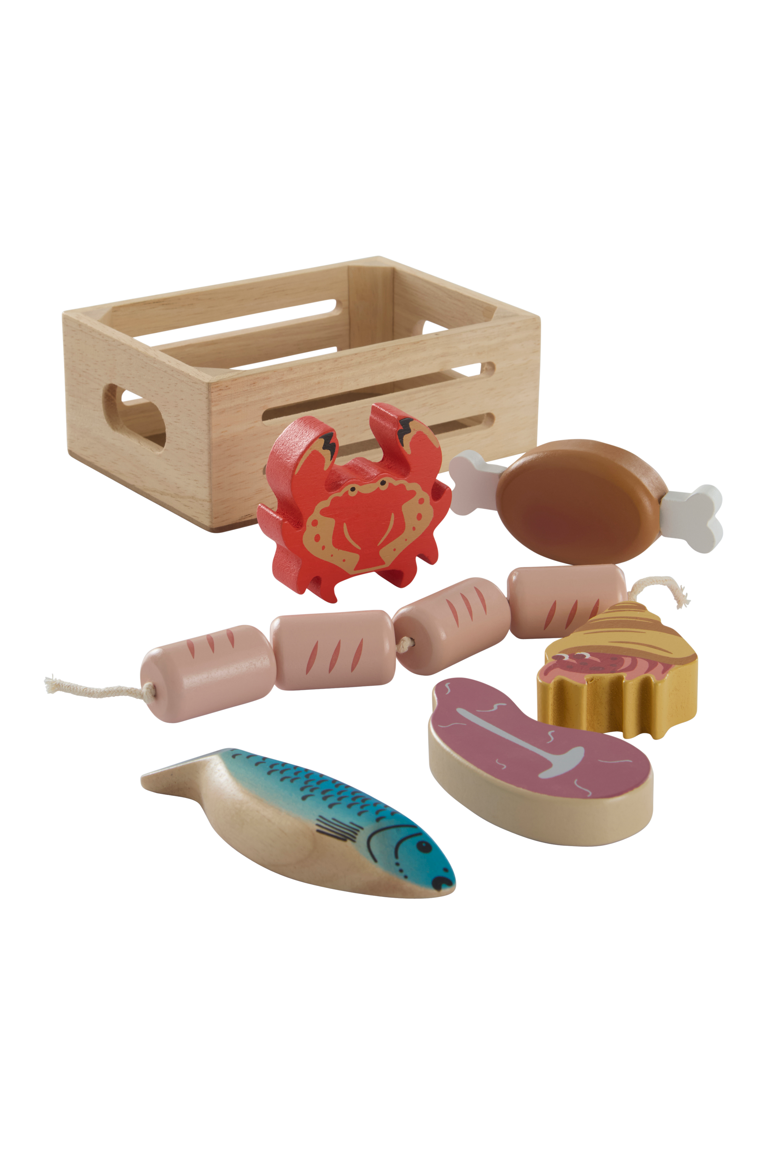 Dette legetøjssæt indeholder en trækasse lavet af MDF og farverige madfigurer fremstillet af gummitræ. Det indeholder en række forskellige ting som fisk, bøf, kyllingelår og meget mere. Det er ideelt til opbevaring og leg og er designet til at glæde børn.