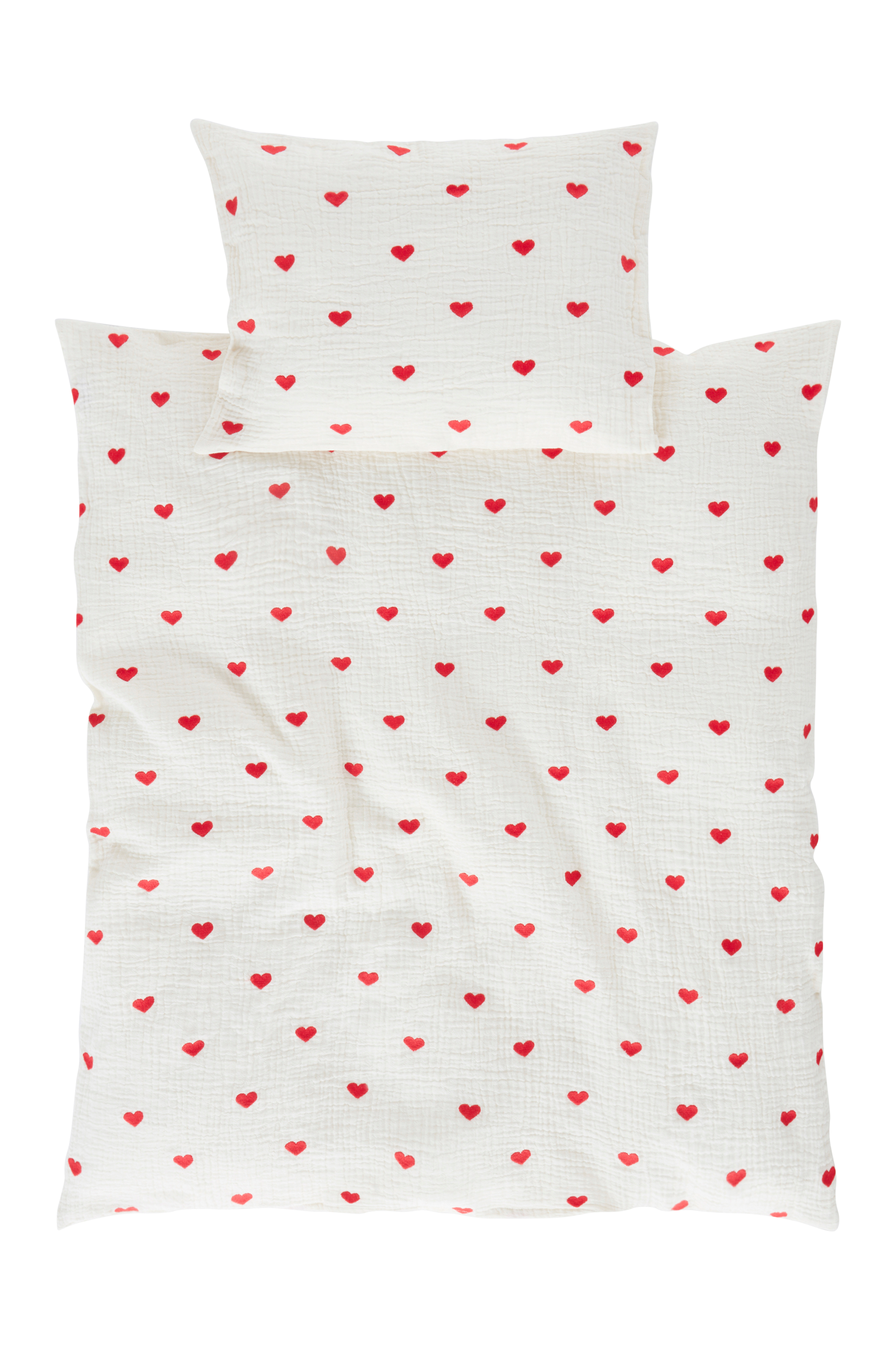 Sengesæt i to dele, et dynebetræk og et pudebetræk, i skøn økologisk bomuldsmusselin med broderede hjerter. Sættet passer til vugge og barnevogn. Musselin er et blødt tyndt stof i to lag, vævet med boblende effekt, hvilket gør stoffet blødt og ekstra praktisk. Du behøver ikke at stryge eller rulle. Det behagelige musselin er skønt at sove i. Pudebetrækkets bagside er ensfarvet. Trådtæthed på 178 tc. (Trådtætheden angiver antal tråde, Thread Count, pr. kvadrattomme i et stof. Jo højere trådtæthed desto højere kvalitet.)