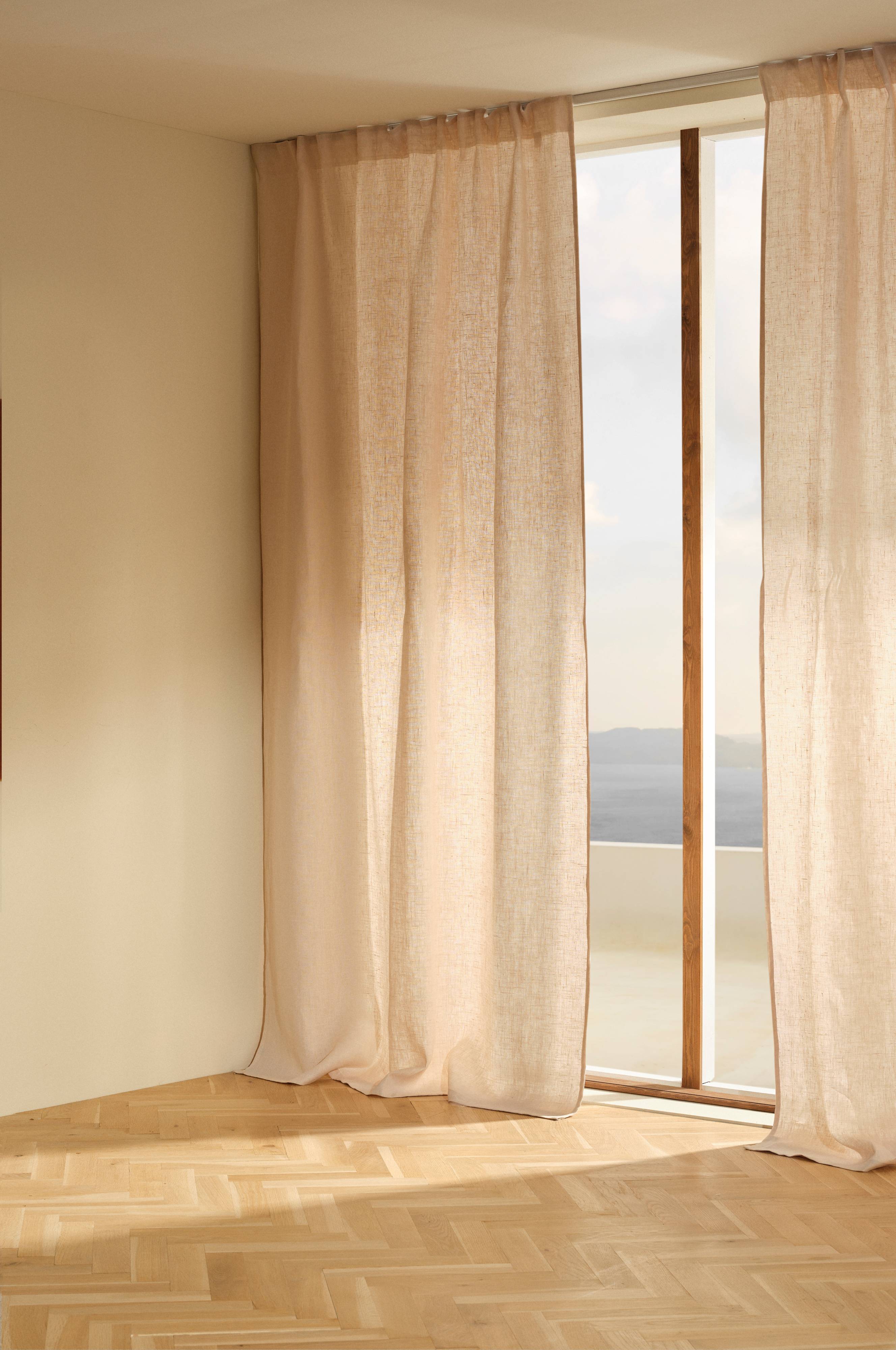 To ensfarvede gardinlængder i skønt hør med fin struktur som giver et eksklusivt udtryk. Med påsyet multifunktionsbånd. Gardinet kan hænges op med fingerhægter, løbegang samt skjult strop.