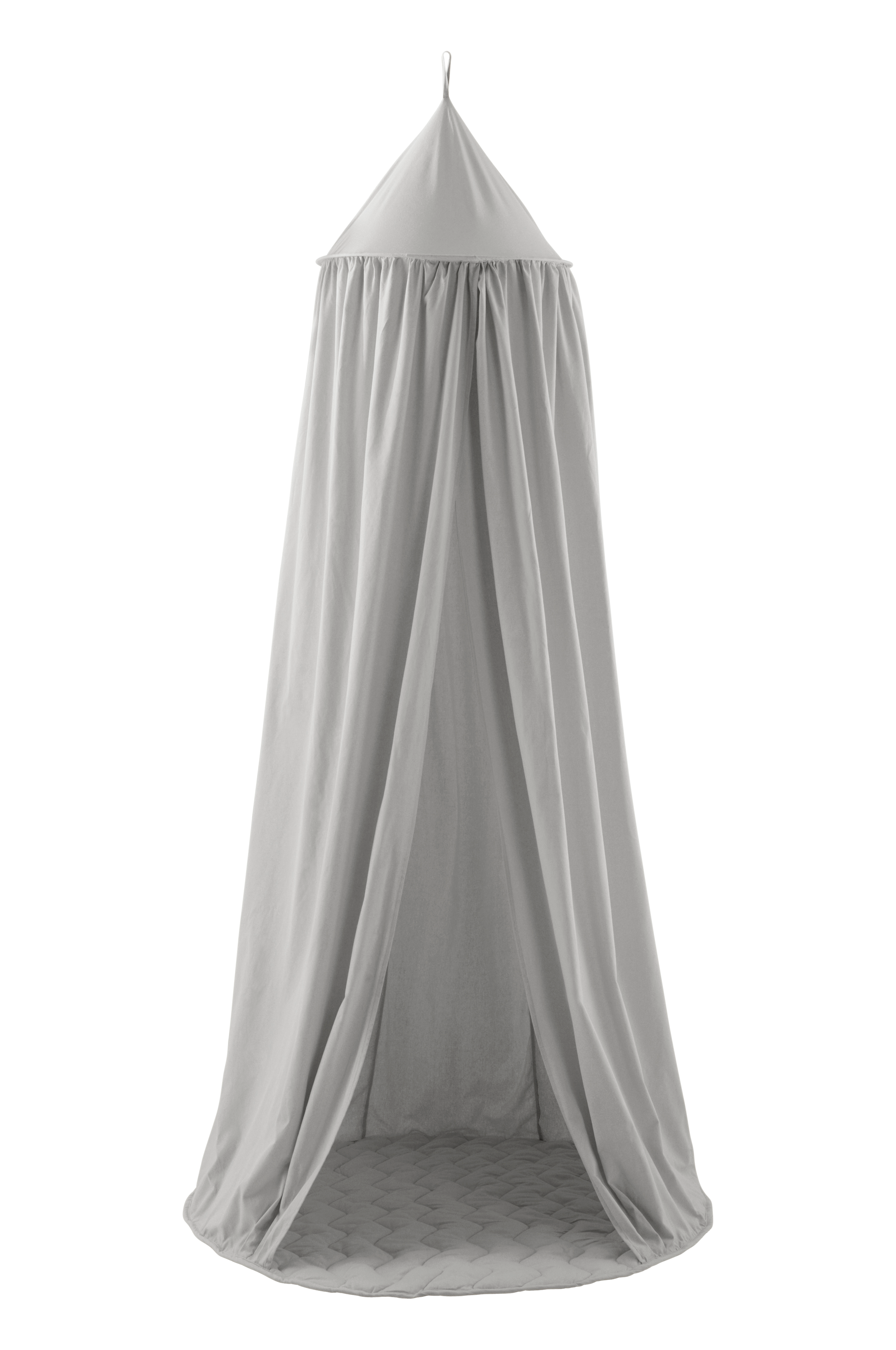 Rundt telt o bomuldsstof med vatteret gulv, som er quiltet, så barnet sidder blødt. Teltet holder formen takket være en metalring som er syet ind foroven i teltet. Du hænger det op på en krog i loftet, og så falder det ned mod gulvet og bliver en hyggelig hule i børneværelset.