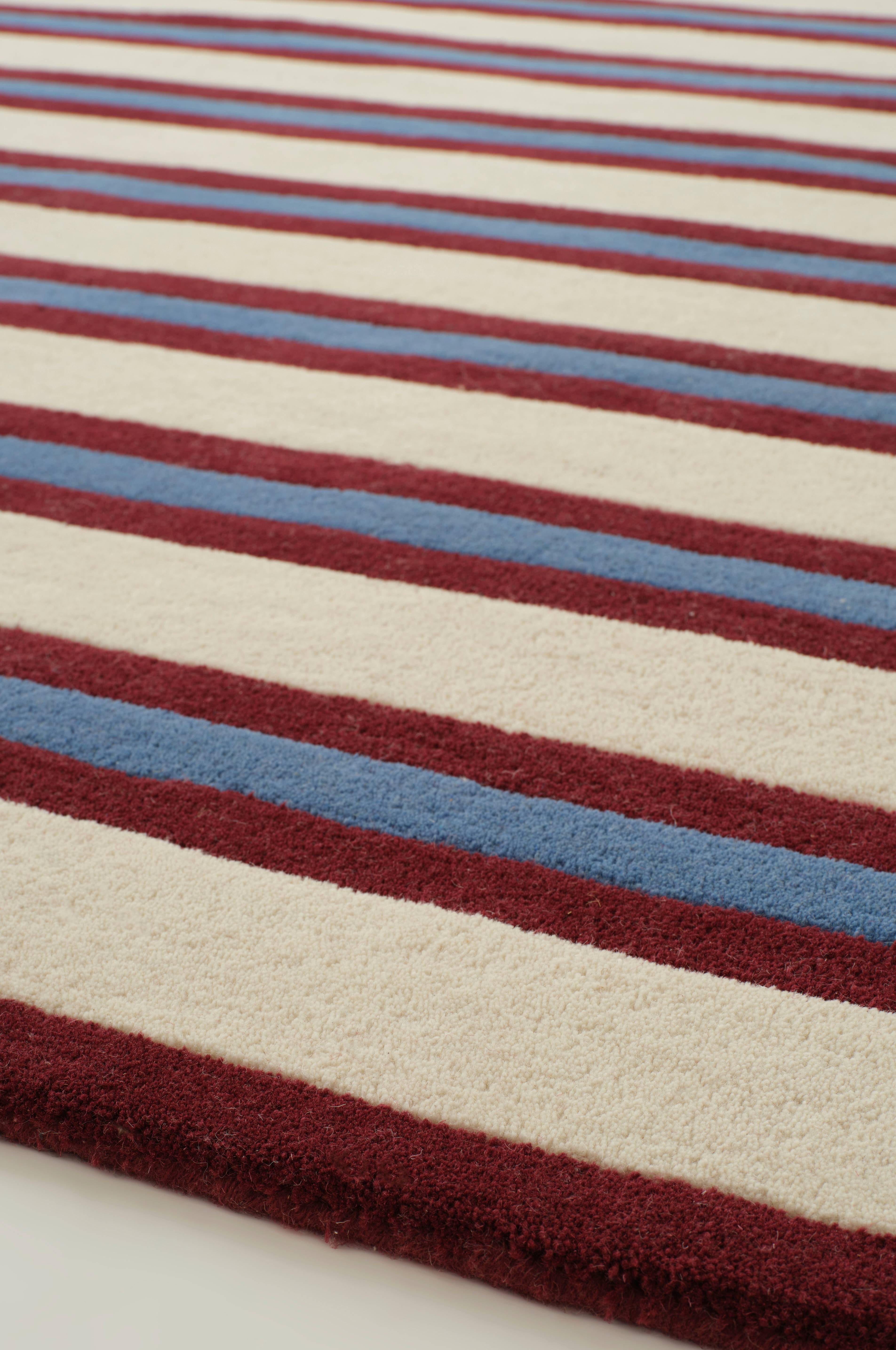 HILLE uldtæppet har et elegant stribet mønster, der giver et moderne touch til ethvert rum. Det er håndtuftet af uld og giver varme og tekstur. Det er ideelt til opholdsrum eller soveværelser og har et dynamisk design, der passer til forskellige indretningsstile.