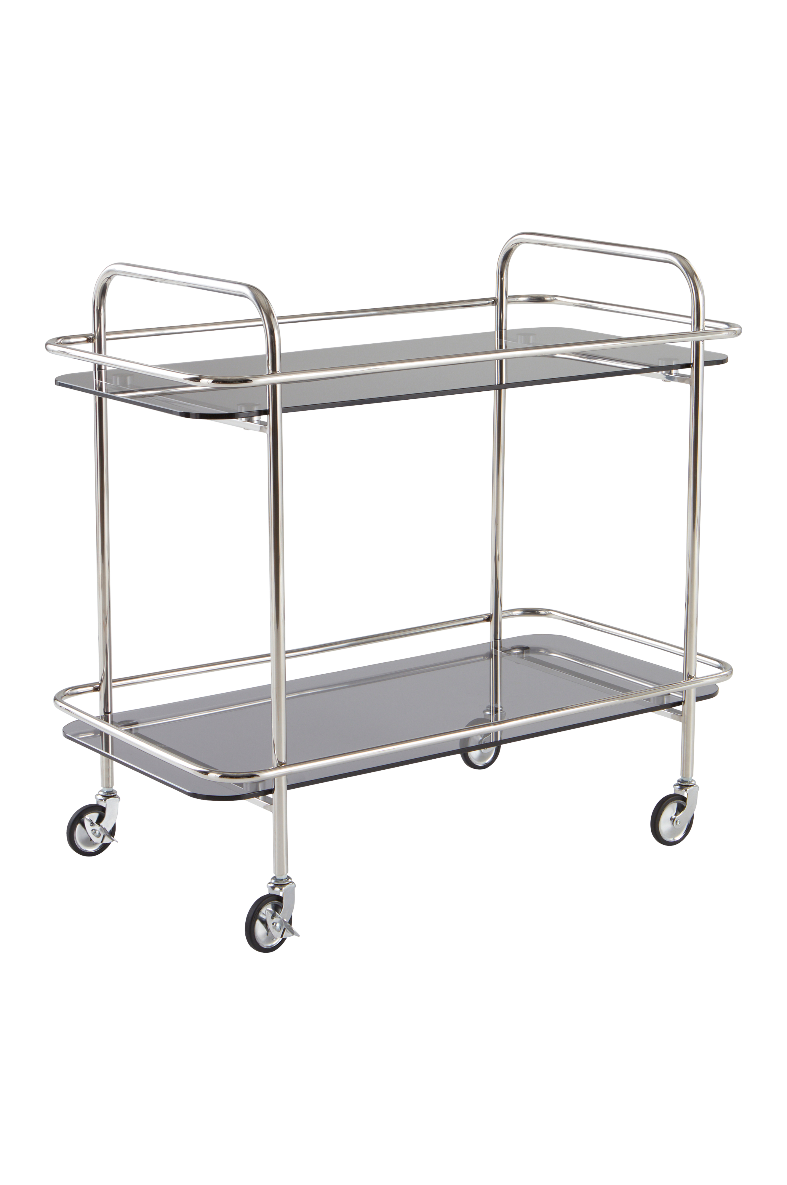 Serveringsvogn af rustfrit stål med poleret overflade, som er blank og glinsende. Serveringsvognen har hylder af lidt mørkere glas. Fordi den er udstyret med fire hjul, kan du nemt rulle vognen med dig og kan bruge den som sofabord, aflastningsbord, sidebord eller barvogn. To af hjulene kan låses. Den elegante stil med glashylder bliver et luksuriøst indslag i din indretning. Skal færdigsamles.