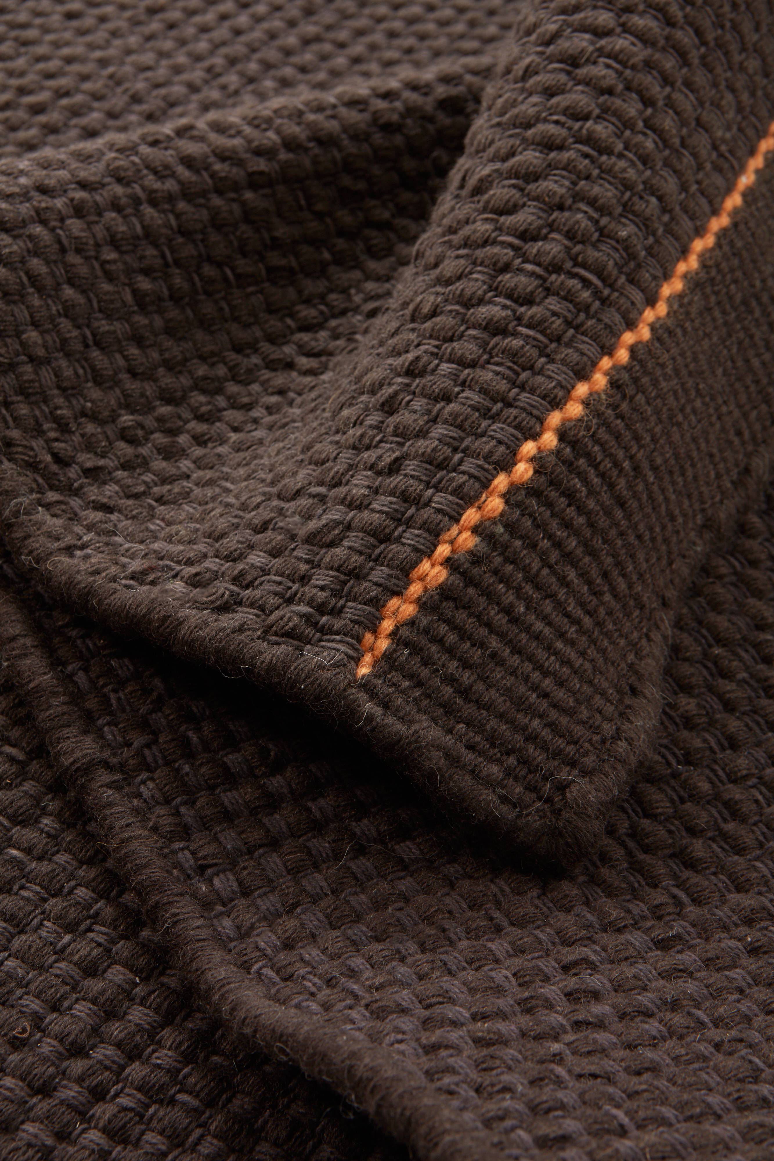 Håndlavet tæppe i fin uld. Tæppet er glatvævet med et lidt grovere udtryk og har et stilrent design som passer ind i mange forskellige stilarter og trends. En diskret stribe langs den korte side fanger øjet, og tæppet bliver en rolig og afbalanceret base i dit rum. Tykkelse 1,1 cm. 2000 g/m².