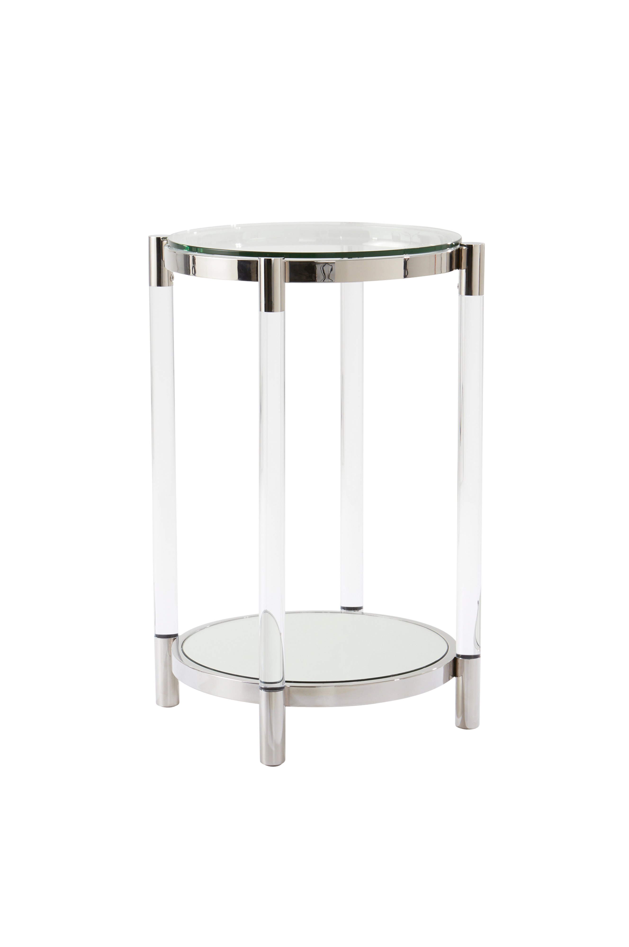 Rundt sidebord af hærdet glas, rustfrit stål, akrylglas og MDF. Bordet er luksuriøst og glamourøst med bordplade i klart glas og afsætningsflade med spejl. Bordbenene er i akrylglas med sølvfarvede detaljer. Bordet passer fint ved sofaen men er smukt enkeltstående. Lidt montering kræves. Monteringsanvisning medfølger.