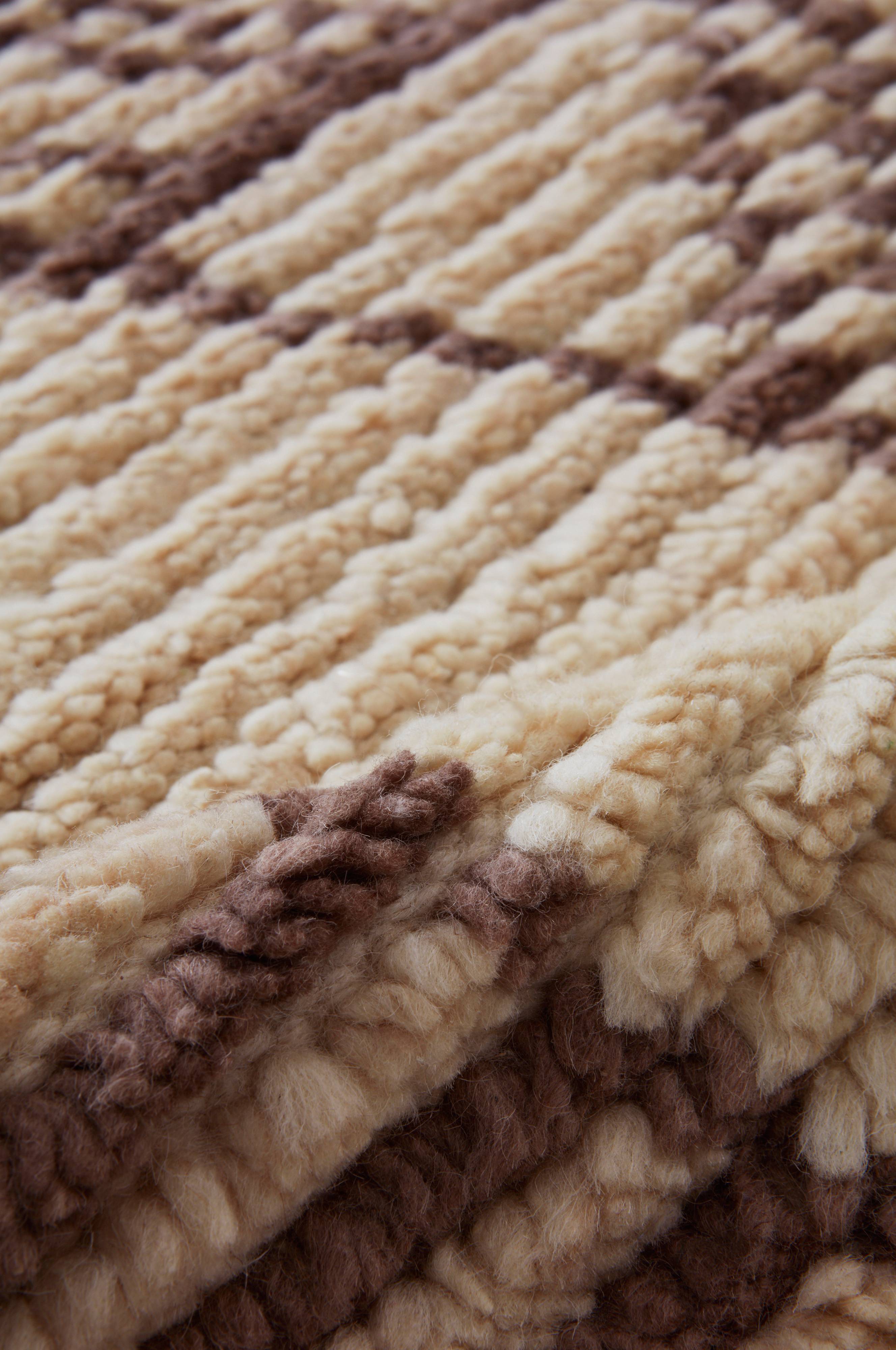 Håndvævet tæppe i skøn, varm uldkvalitet med lidt bomuld. JEEMA er marokkansk i stilen med asymmetriske striber som går i beige og brune toner. Gulvtæppe har blød og skøn luv samt en fin frynsekant langs enderne. Uld er et naturligt materiale som varmer skønt og er helt perfekt til dig som har lidt kolde gulve derhjemme. Uld er desuden et praktisk valg, fordi uld er naturligt smudsafvisende. Det fine håndværk gør hvert gulvtæppe unikt. Længde på frynser 10 cm. Luvhøjde 1,5 cm. Tykkelse 2,3 cm. 2300 g/m².