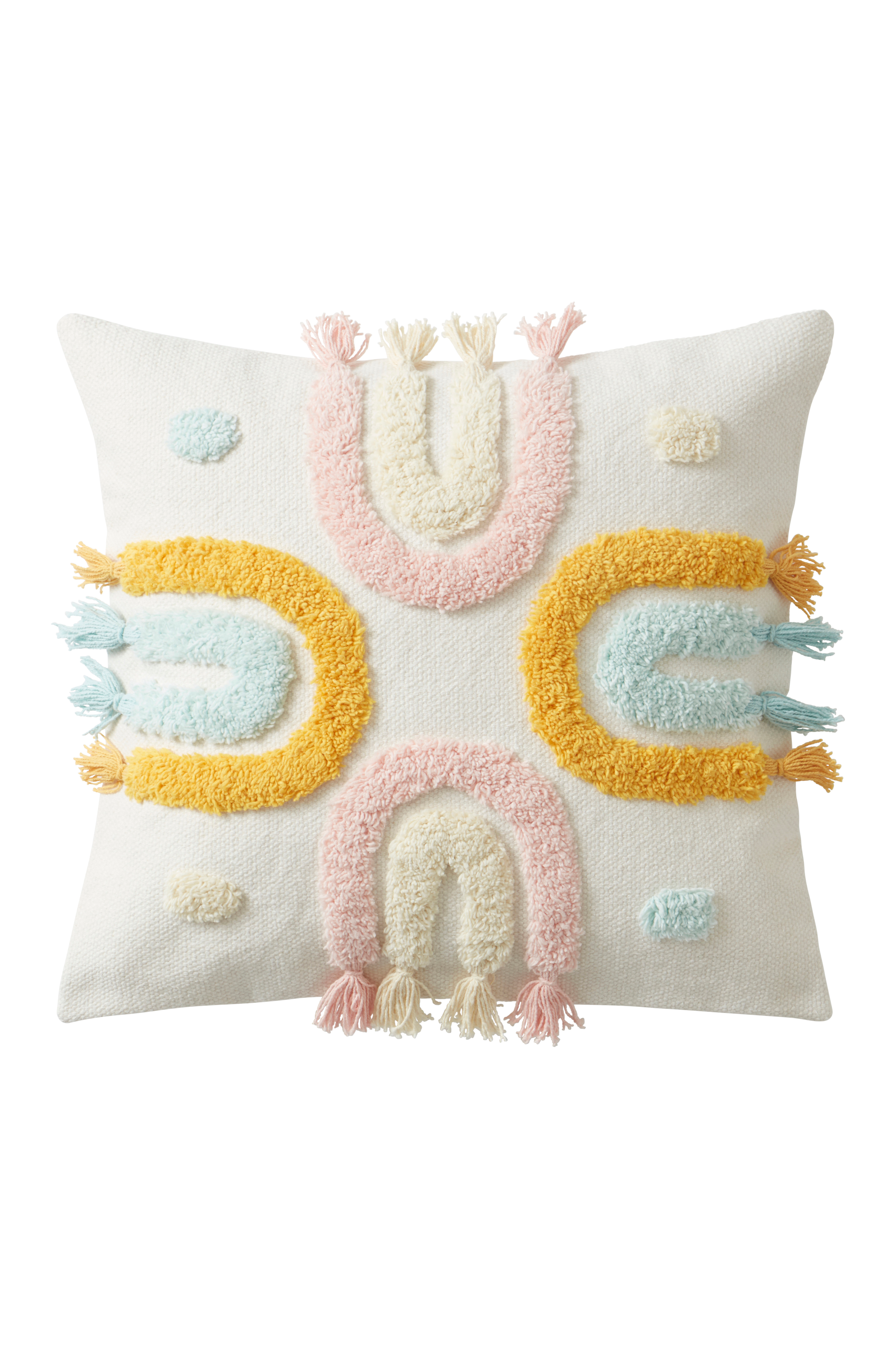 1-pak pudebetræk i lidt grovere, økologisk bomuldsstof med tuftet mønster i blødt garn som går i blide pasteller. Buerne afsluttes med små kvaste. Ensfarvet bagside med skjult lynlås.